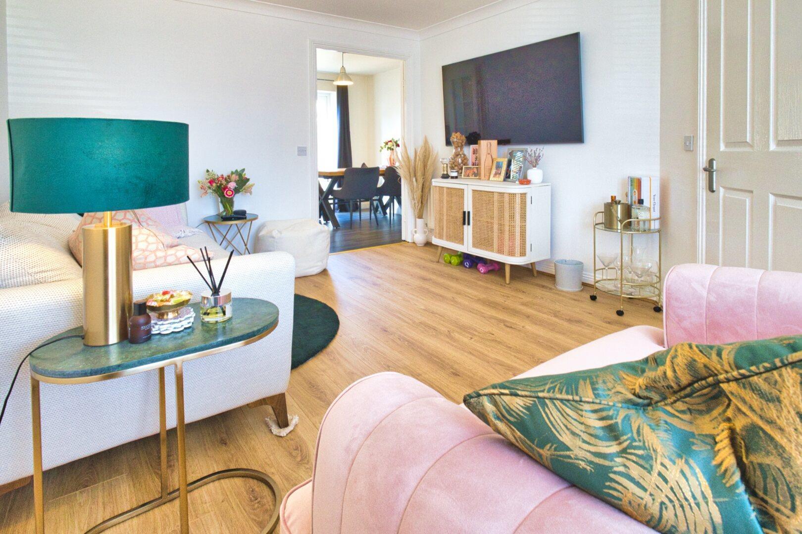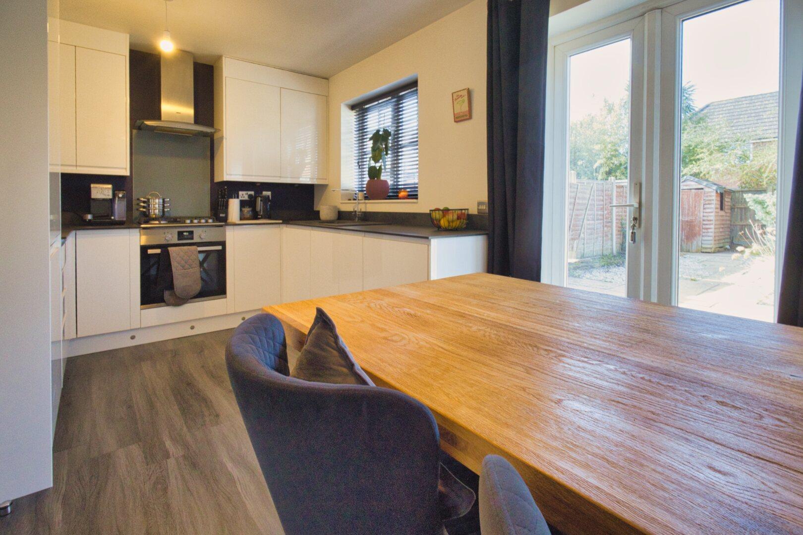 With a fashionable range of gloss white fitted kitchen units with soft close doors, consisting inset black single drainer resin sink unit, chrome mixer taps above, cupboard beneath. Contrasting grey slate finish working surfaces above with inset four ring stainless steel gas hob unit, single fan assisted oven with grill beneath. Stainless steel extractor hood above, matching upstands. Further matching range of wall mounted cupboard units including a wine rack. Further integrated appliances include a fridge freezer, washing machine and dishwasher. Concealed lighting over the working surfaces, LED lighting in the kick panels. Grey wood finish LVT flooring, double panelled radiator. Useful under stairs storage cupboard. UPVC SUDG French doors leading to the rear garden.