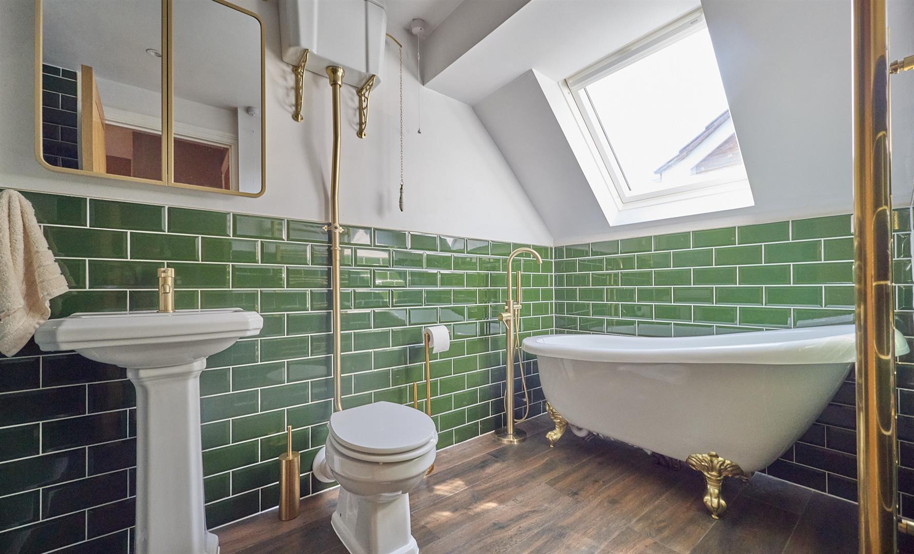 With a four piece suite consisting of a roll top free standing bath with floor standing mixer tap and shower attachment, fully tiled walk in shower cubicle with shower screen to side, low level WC and pedestal wash hand basin. Half tiled surrounds, heated towel rail, laminate wood strip flooring and inset ceiling spotlights.