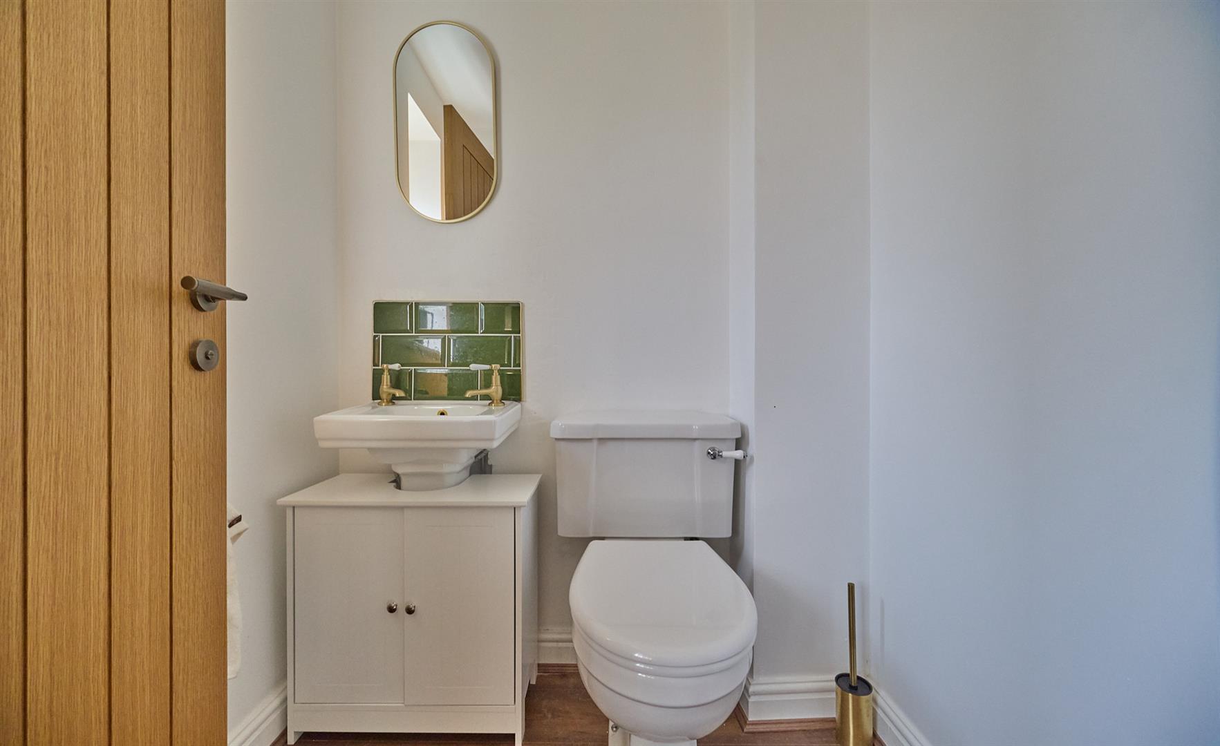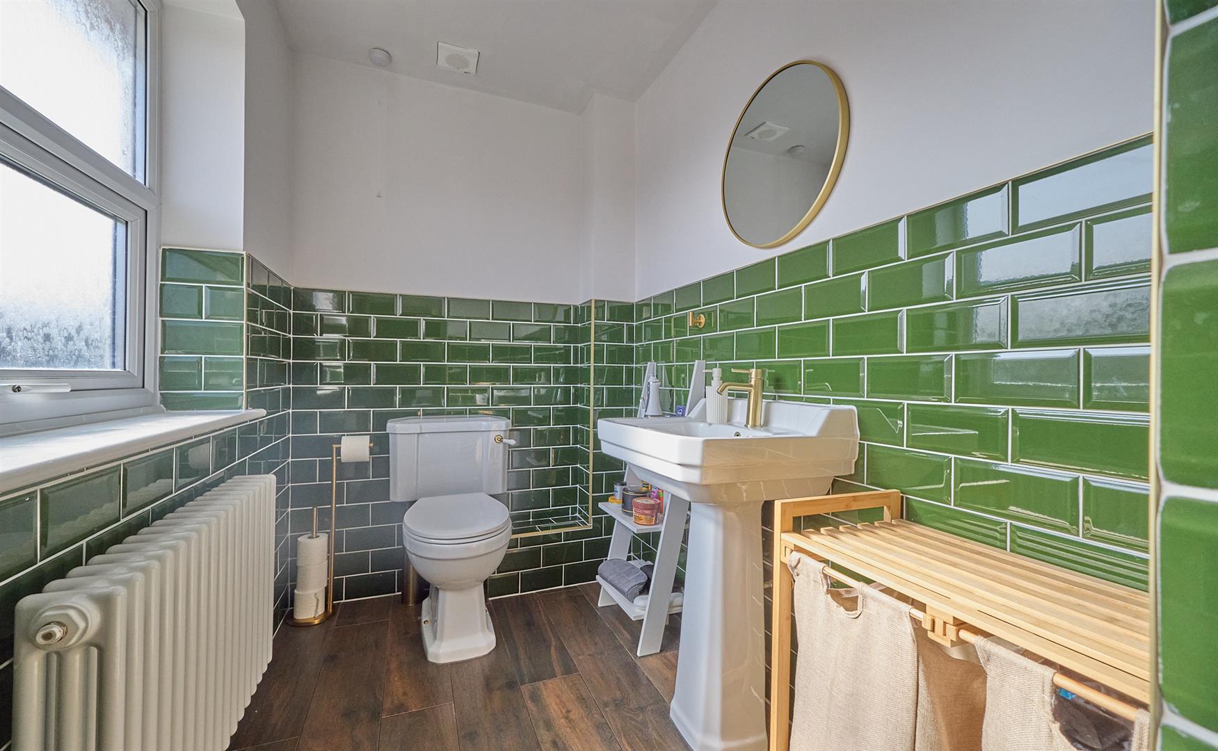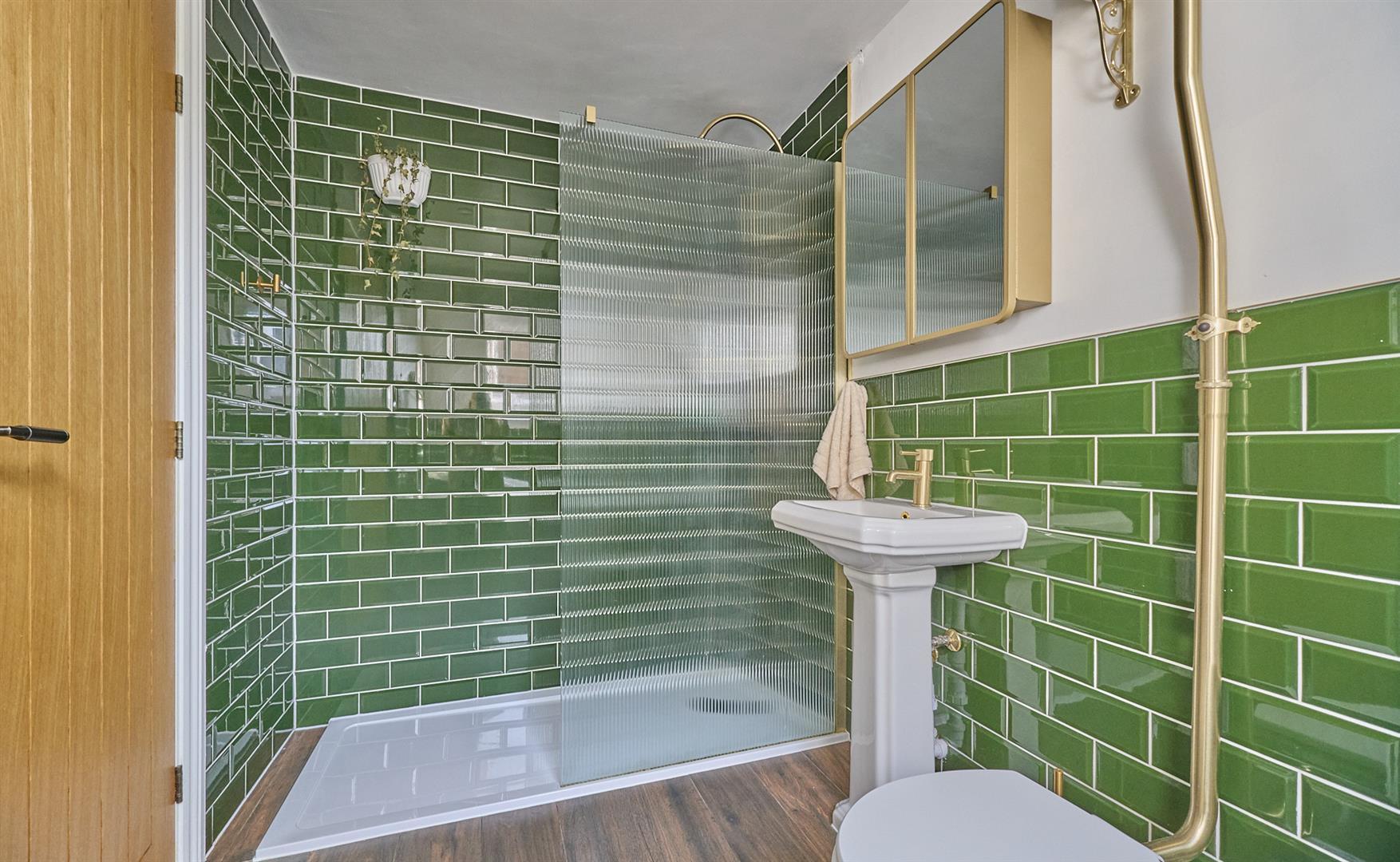 With fully tiled shower cubicle with shower attachment and shower door, low level WC and pedestal wash hand basin. Half tiled surrounds, laminate wood strip flooring, inset ceiling spotlights, radiator.