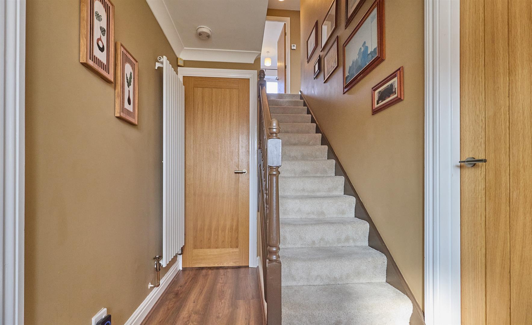 With stairway to first floor, vertical radiator, laminate wood strip flooring, smoke alarm and oak panelled interior door to