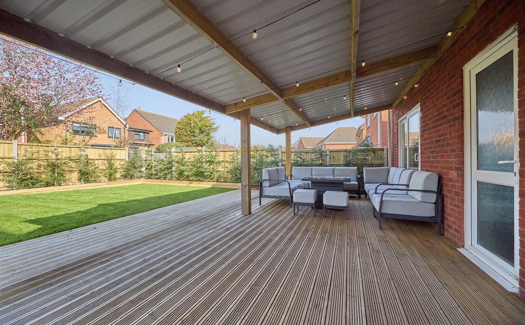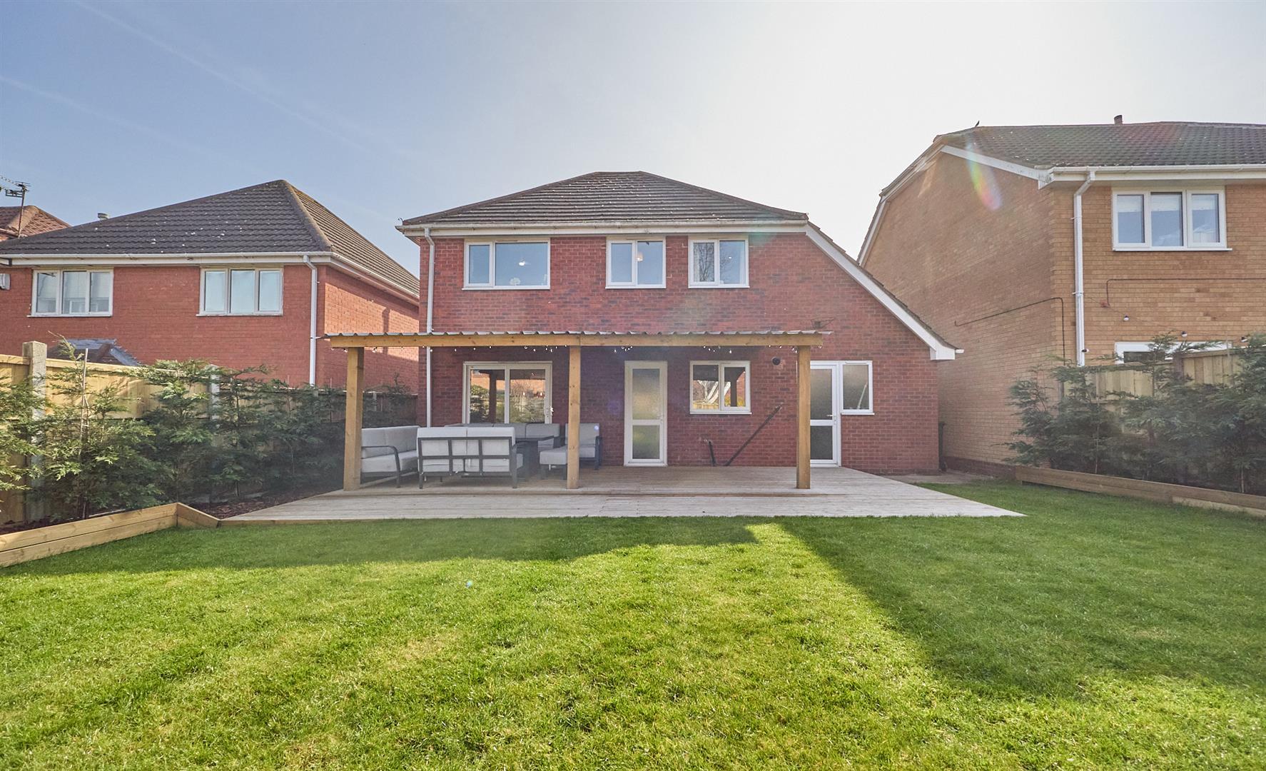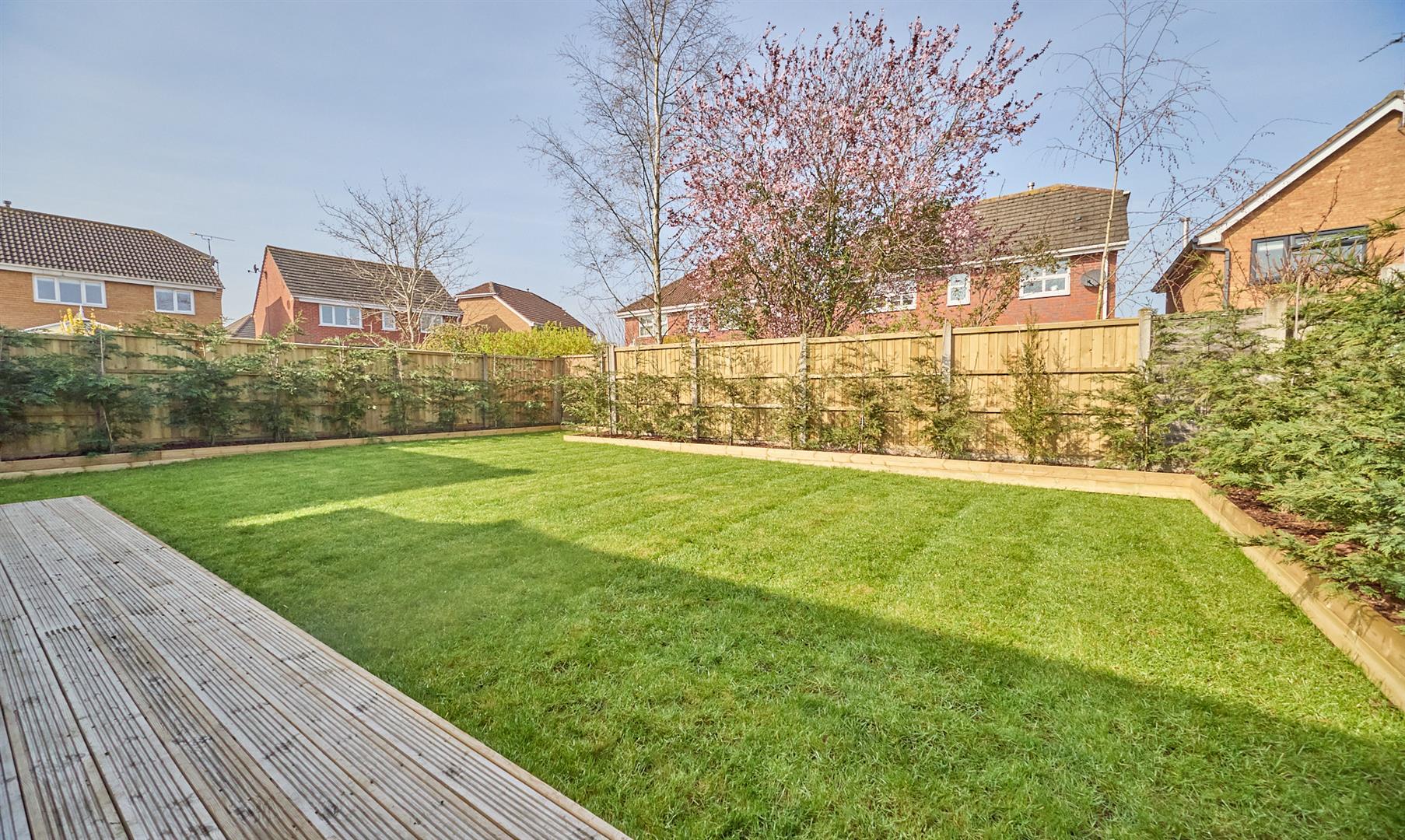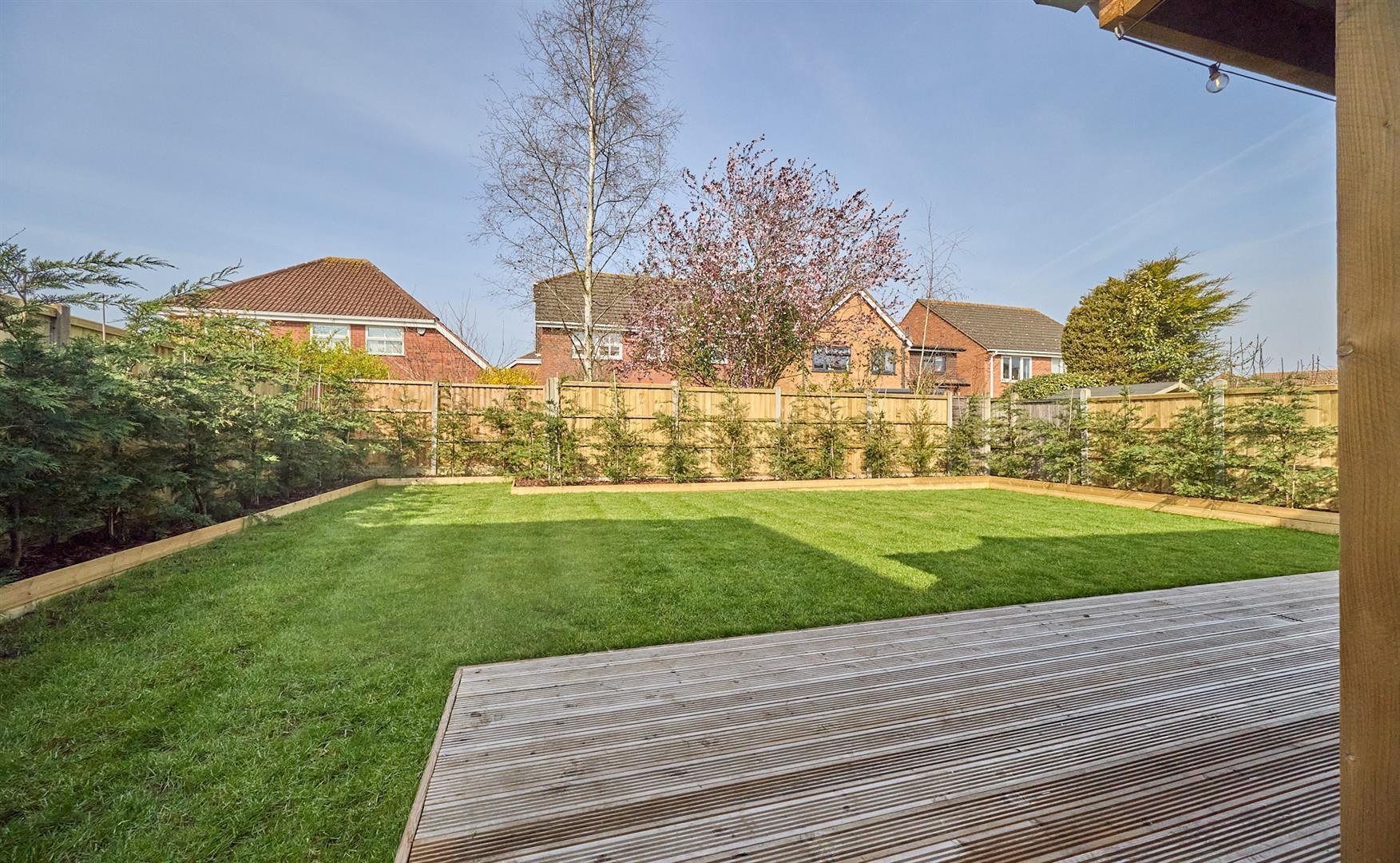 The property is nicely situated set back from the road with a lawned front garden to side and double width driveway leading to the garage (8.67m X 2.56m) with up and over door to front, light, power and pedestrian door to the rear garden. Access down the left hand side of the property leads to the good sized fully fenced and enclosed rear garden with a decking area to the rear of the property, which is partially covered, with outside water tap and lighting. The remainder of the garden is principally laid to lawn with surrounding borders with wood chippings and well stocked with trees.