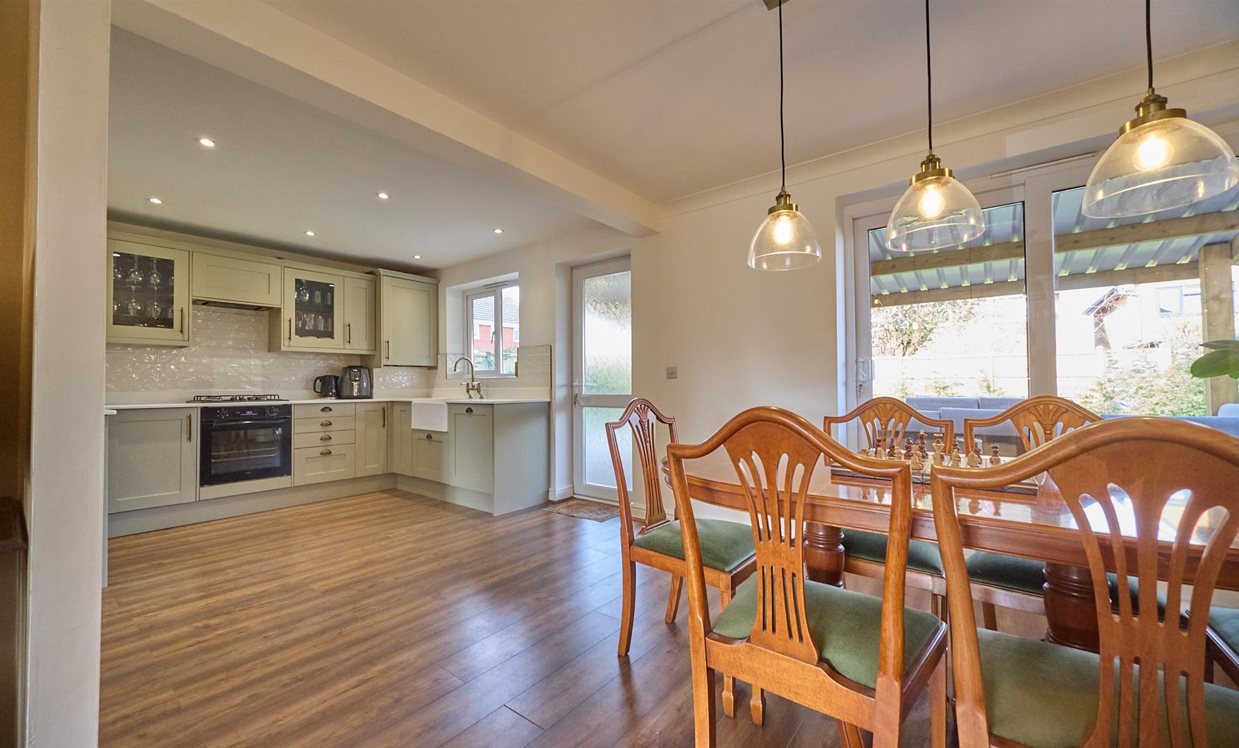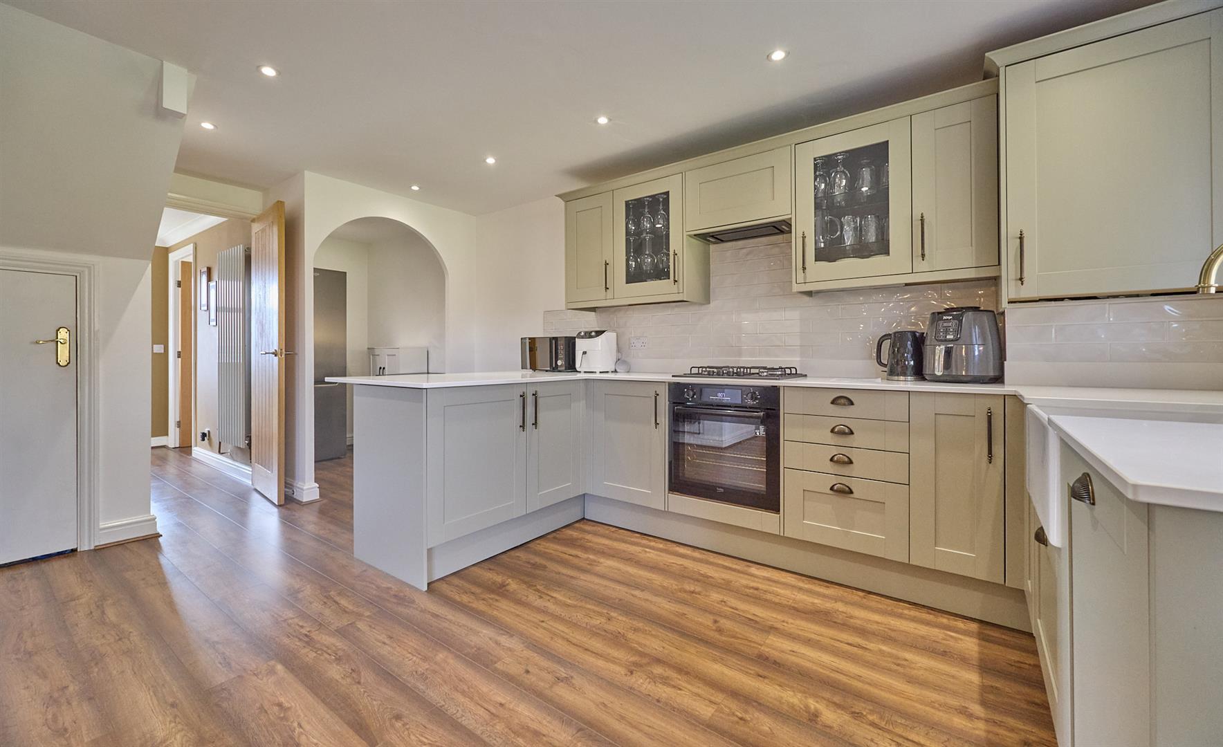 With a range of floor standing kitchen units in sage green with white quartz roll edge surfaces above and inset Belfast sink with gold coloured mixer tap. A range of integrated appliances include a Beko oven with Hotpoint gas hob above with extractor and a dishwasher. Further range of matching wall mounted cupboard units one housing the Worcester gas combination boiler for central heating and domestic hot water (still under warranty). White tiled splashbacks, inset ceiling spotlights, laminate wood strip flooring and vertical radiator. Archway to