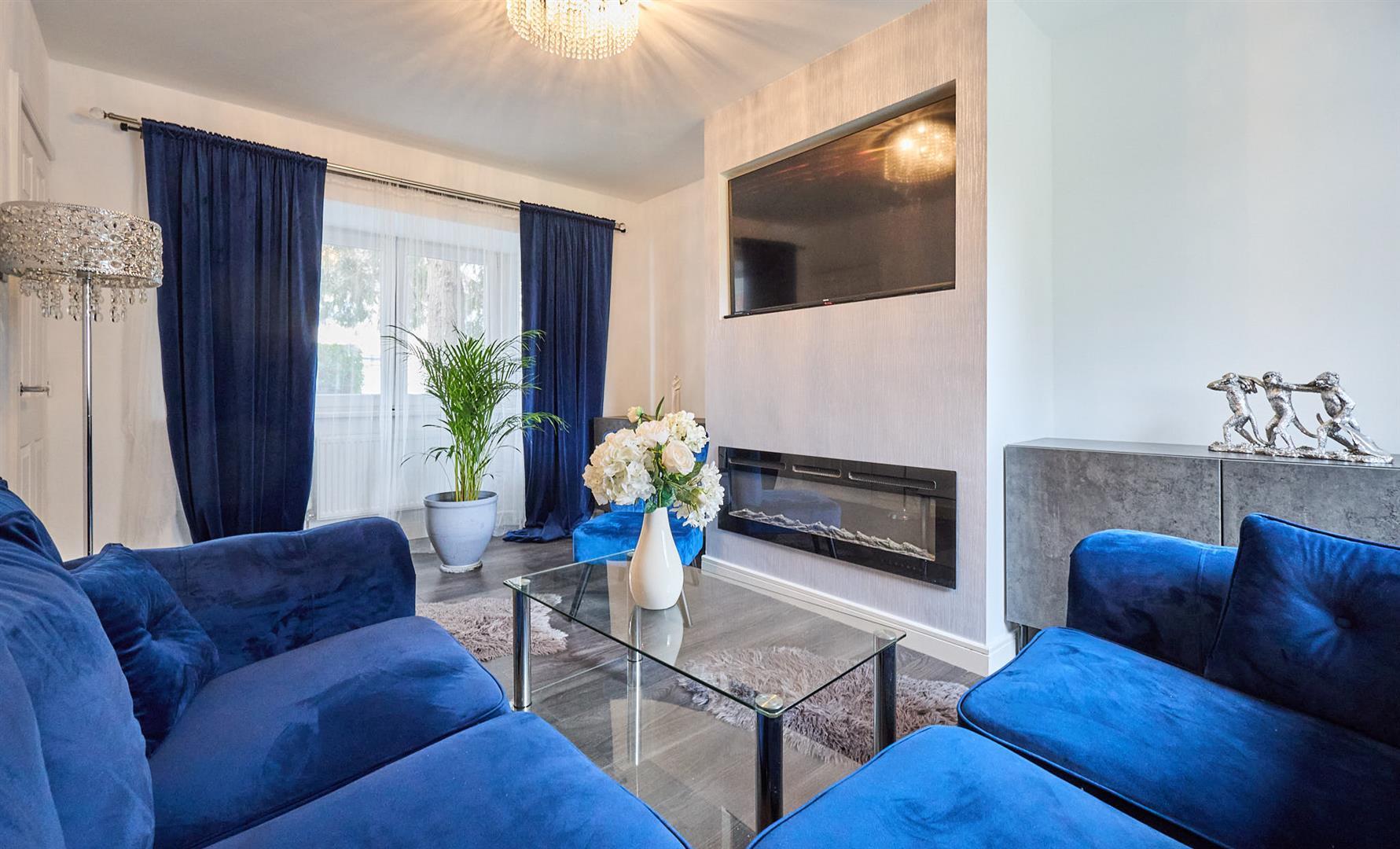 With a full height media wall with a large area for a flat screen TV, living flame log effect electric fire with remote control. Grey oak finish laminate wood strip flooring, double panelled radiator.