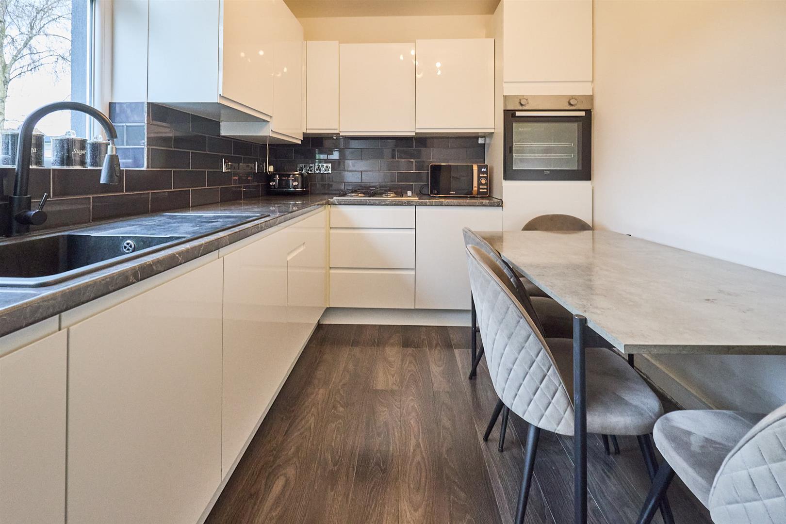 With a fashionable range of gloss white fitted kitchen units with soft close doors consisting inset black single drainer resin sink unit, mixer taps above, cupboard beneath. Further matching range of floor mounted cupboard units and three drawer unit, contrasting grey marble finish roll edge working surfaces above with inset four ring stainless steel gas hob unit, integrated extractor hood above, tiled splashbacks. Further range of wall mounted cupboard units, one concealing the Ideal gas condensing combination boiler for central heating and domestic hot water. Integrated washing machine, dishwasher and a single oven with grill. Grey oak wood finish laminate wood strip flooring, fashionable grey vertical radiator.