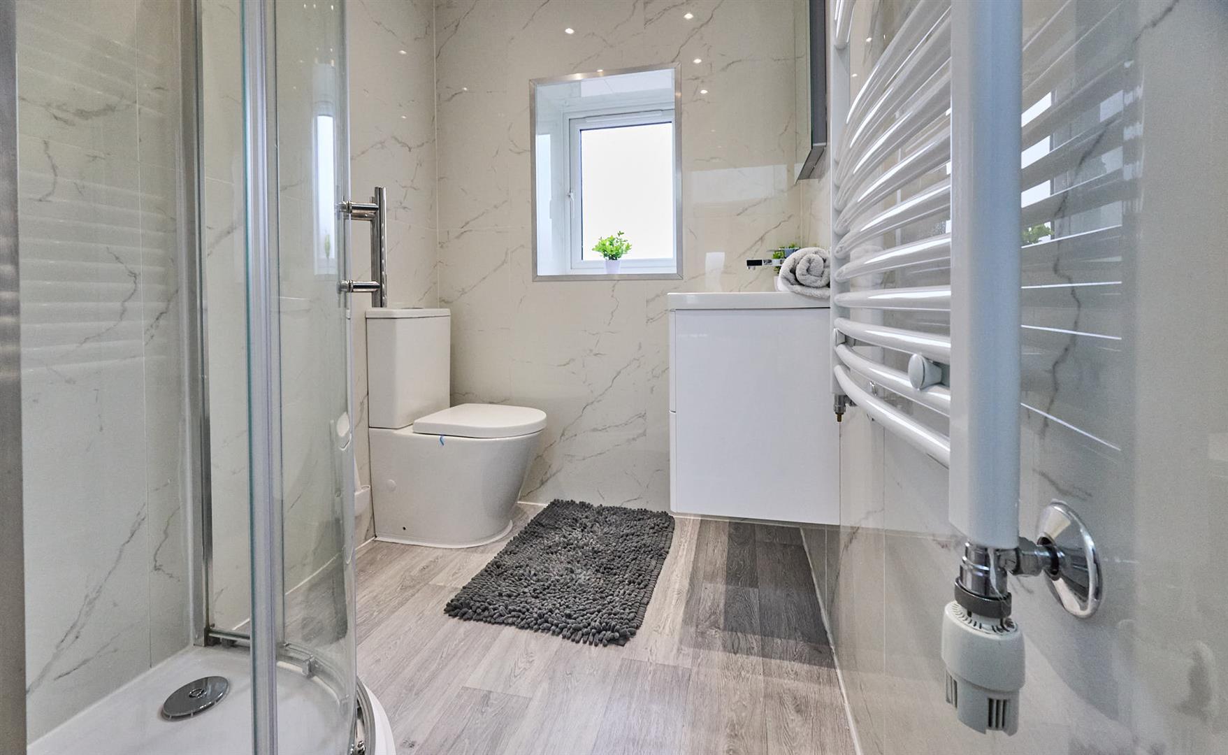 With white suite consisting of a porcelain tiled shower cubicle with glazed shower doors, rain shower and handheld attachment above, wall mounted vanity sunk unit with gloss white drawers beneath, illuminated mirror above, extractor fan, low level WC, white heated towel rail and inset ceiling spotlights. Contrasting fully porcelain tiled surrounds.