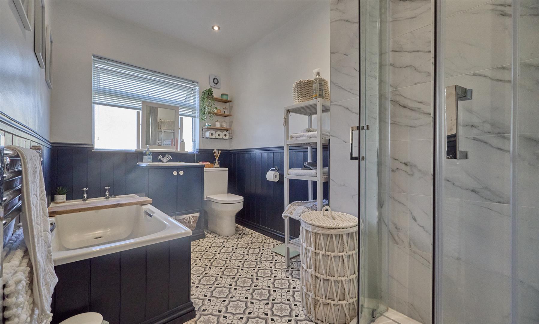 With a four piece suite consisting of a panelled bath with mixer tap, a corner shower cubicle with two shower attachments and sliding shower screen, low level WC and vanity sink unit with double cupboard beneath. Dark blue wood panelling, chrome heated towel rail, vinyl flooring, inset ceiling spotlights and extractor fan.