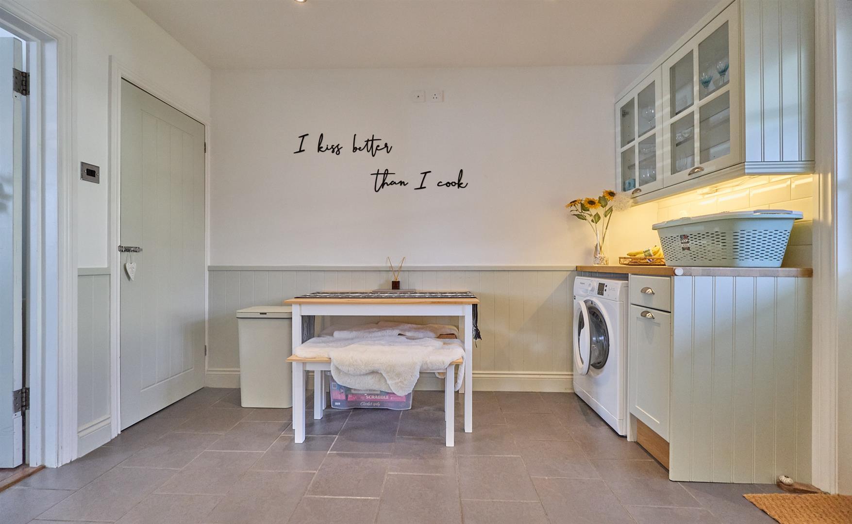 With a range of floor standing fitted kitchen units with wood roll edge working surfaces above and inset Belfast sink with mixer tap. Included appliances are the Delonghi Range cooker with five ring gas hob and a Kenwood slimline dishwasher. Further matching range of wall mounted cupboard units. Inset ceiling spotlights and tiled flooring with under floor heating. Appliance recess point and a matching display glass fronted cupboard above. Wooden and glazed door to the rear garden and a wooden interior door to a large storage cupboard with power and houses the main control panel for the alarm system.
