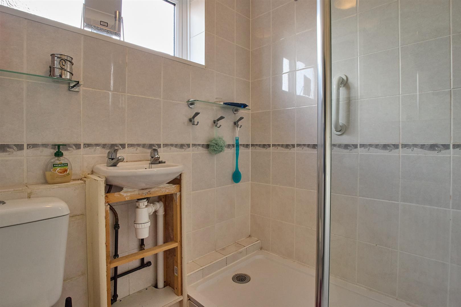 With white suite consisting shower tray with shower screen and curtain, wall mounted power shower. Low level WC. Pedestal wash hand basin. Fully tiled surrounds. Wall mounted mirror fronted cupboard. Mirror. Double panelled radiator. Tiled flooring.