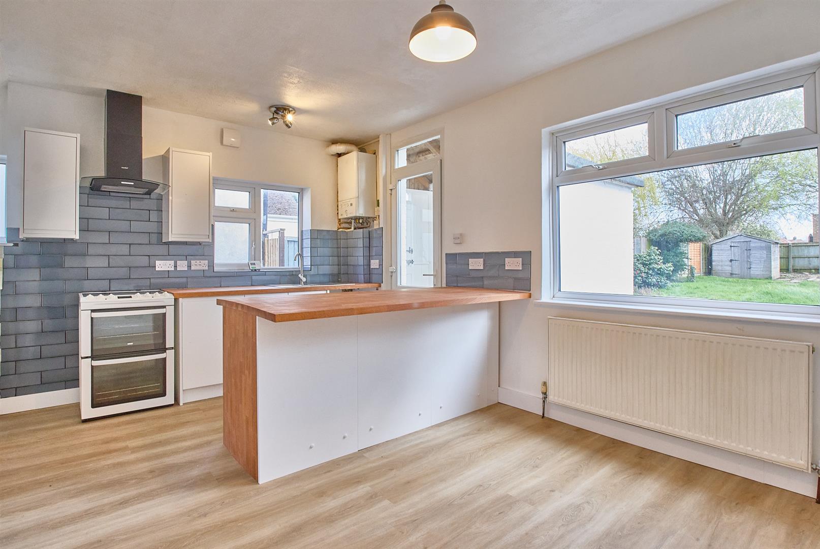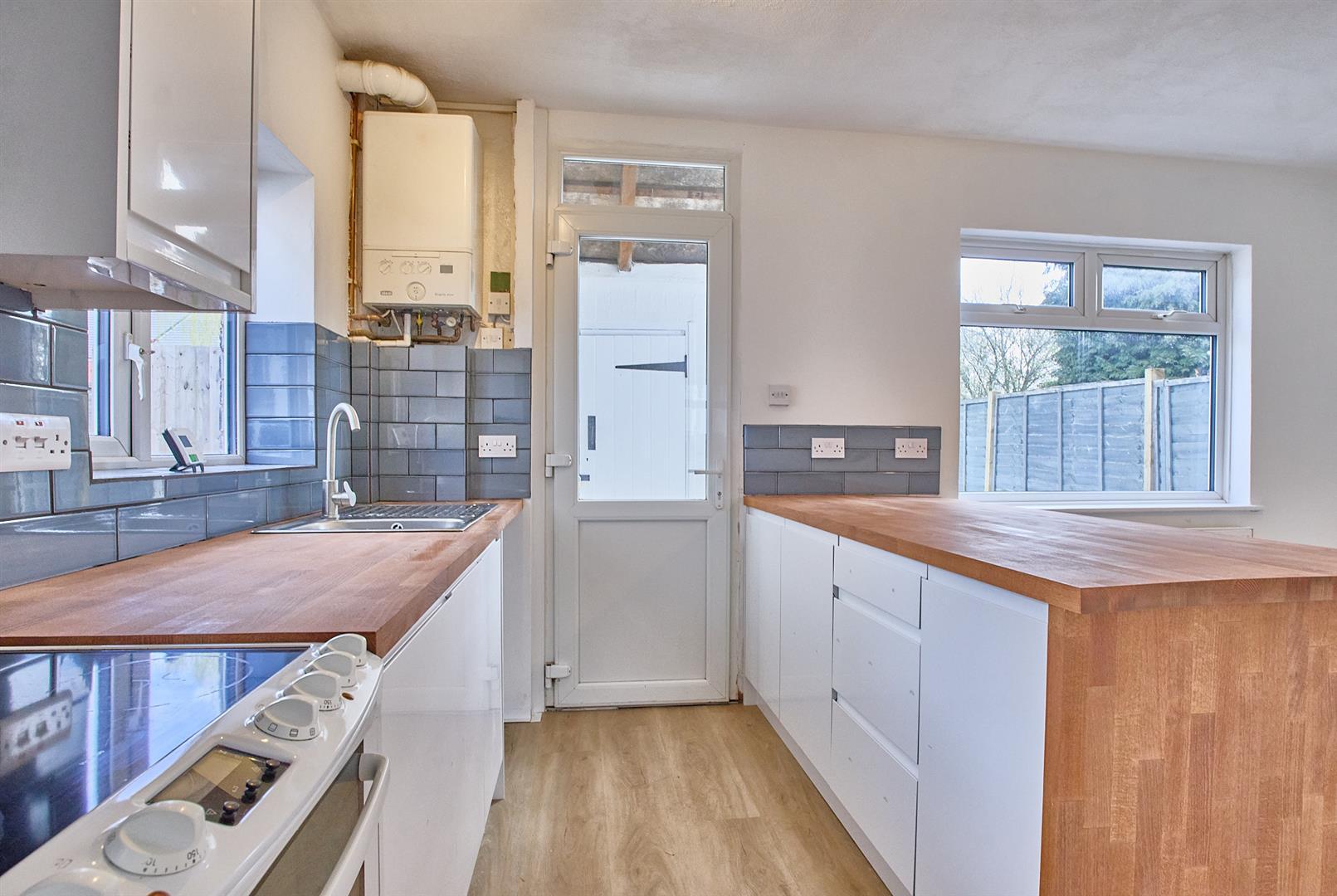 With a single panel radiator, a range of white gloss handle less kitchen cupboard units with hardwood working services, stainless steel sink with brush chrome mixer tap, free standing Zanussi oven with four ring hob and extractor fan above. Further matching range of wall cupboard units, tiled splashbacks, wall mounted Ideal combination boiler for domestic hot water and gas central heating, wall mounted fuse board, cupboard housing the gas and electric meters, UPVC SUDG door to rear garden.