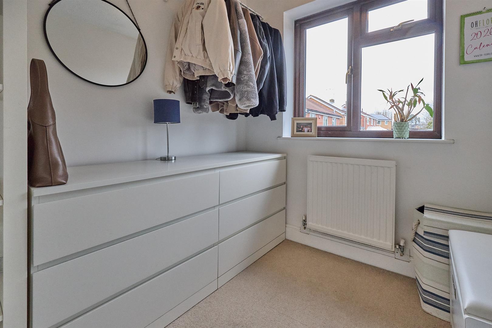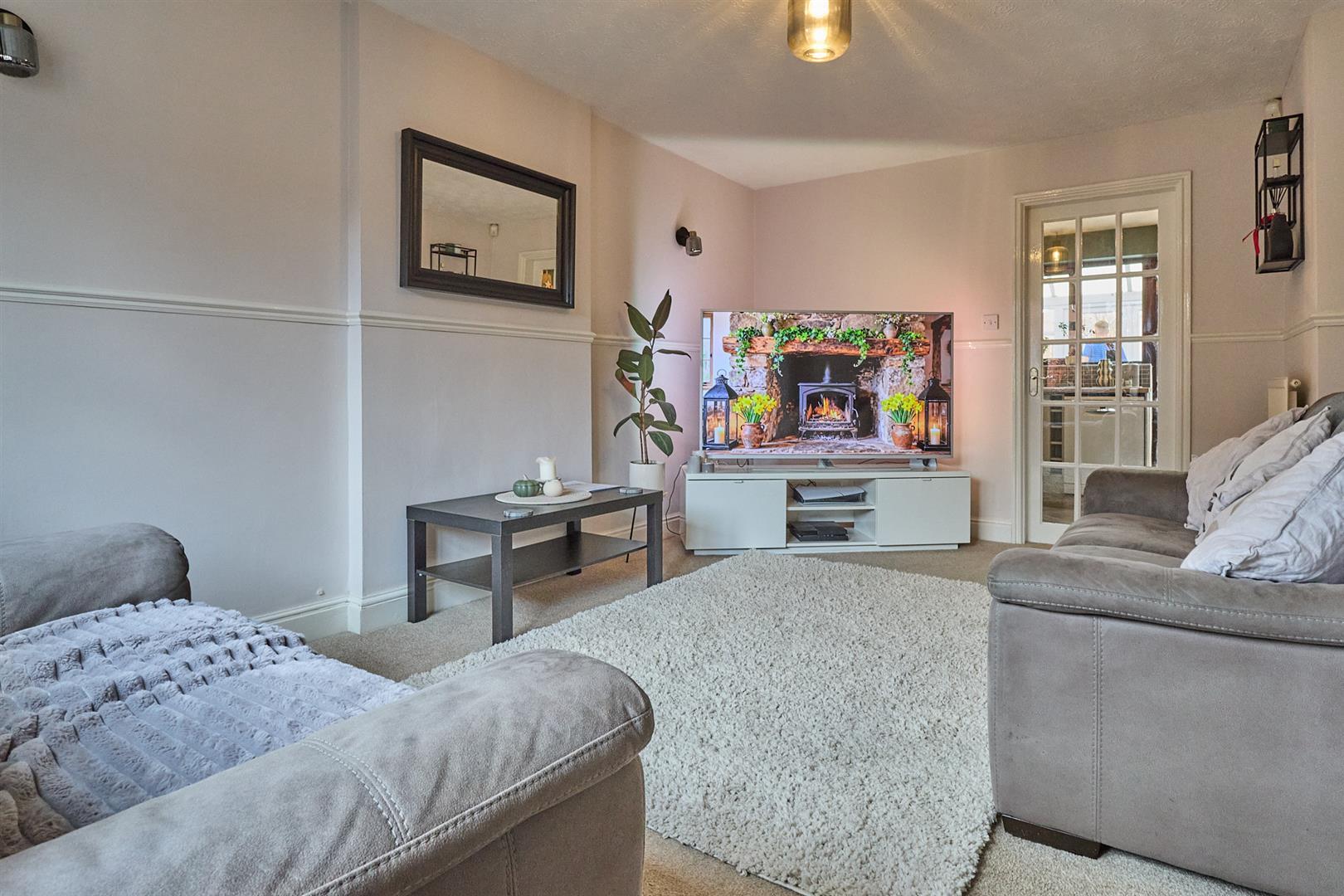 With two radiators, three matching wall lights, TV aerial point. White wood panel and glazed door leads to