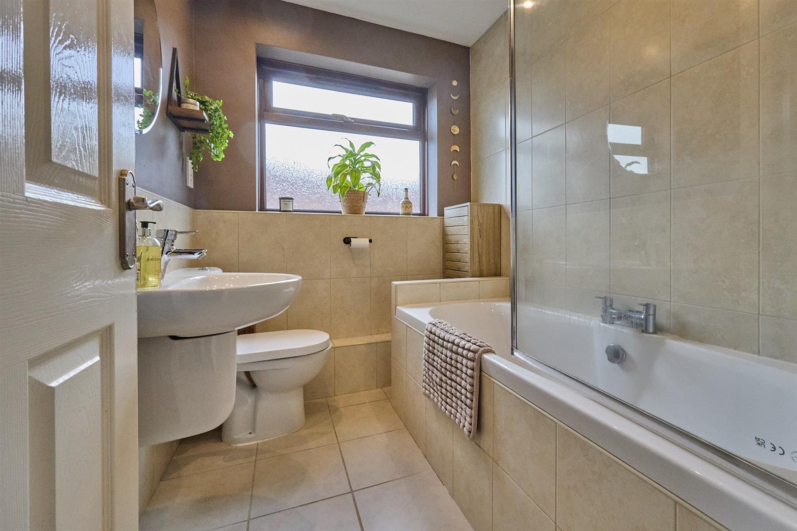 With white suite consisting double ended panelled bath, mains shower unit above, glazed shower screen to side. Wall mounted sink unit and low level WC, contrasting tiled surrounds including the flooring, chrome heated towel rail, inset ceiling spotlights and extractor fan.