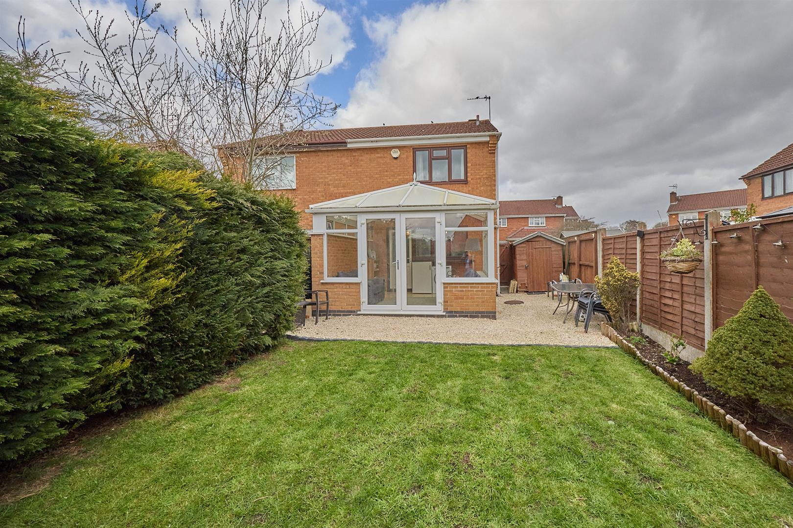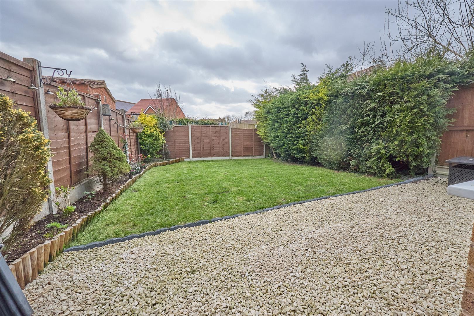The property is nicely situated in a cul de sac set back from the road, the front garden is hard landscaped in decorative stones with inset shrubs, a tarmacadam driveway leads down the side of the property offering ample car parking and ample room for an garage extension (STPP). A timber gate leads to the fully fenced and enclosed rear garden which has a L shaped full width decorative stone patio adjacent to the rear of the property beyond which the garden is principally laid to lawn with surrounding beds. The garden has a sunny aspect with an outside light and timber shed.