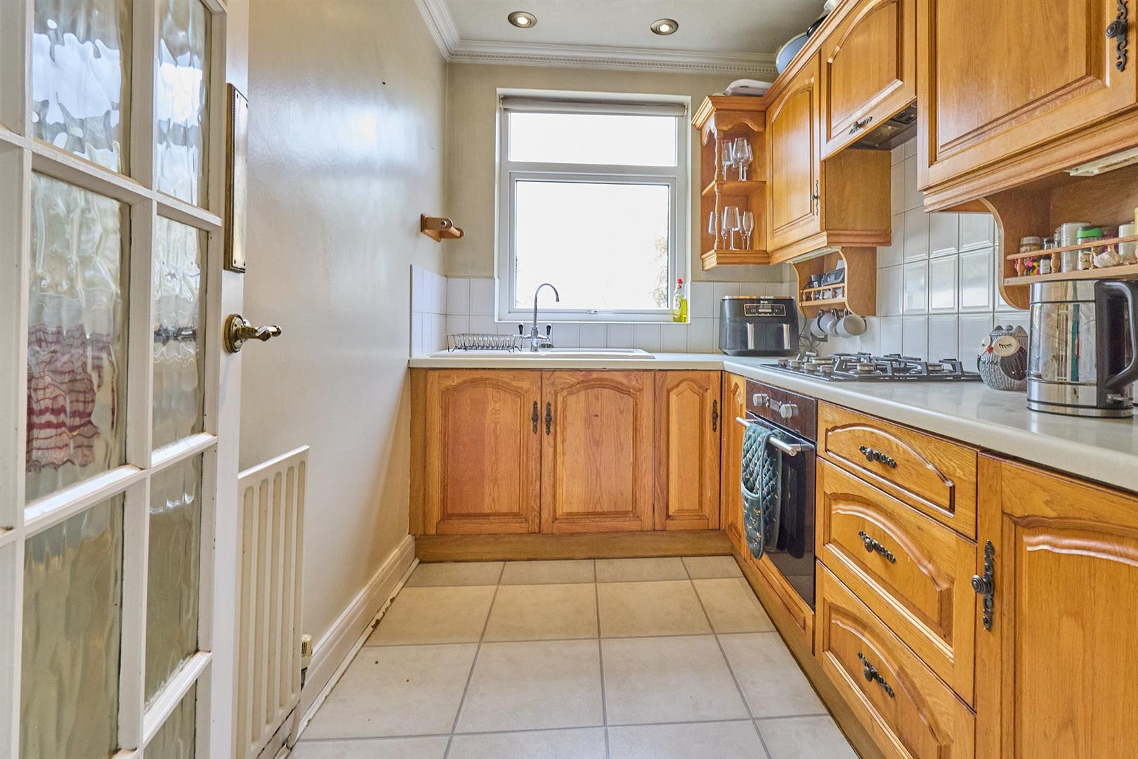 With a range of medium oak fitted kitchen units consisting inset white ceramic single drainer sink unit mixer tap above double base unit beneath, further matching cupboard units and drawers, contrasting white roll edge working surfaces above with inset four ring gas hob unit, single fan assisted oven with grill beneath integrated extractor above. Tiled splashbacks, further matching wall mounted cupboard units and gallery shelving and spice rack, integrated larder fridge, laminate tile flooring, radiator, inset ceiling spotlights, coving to ceiling.