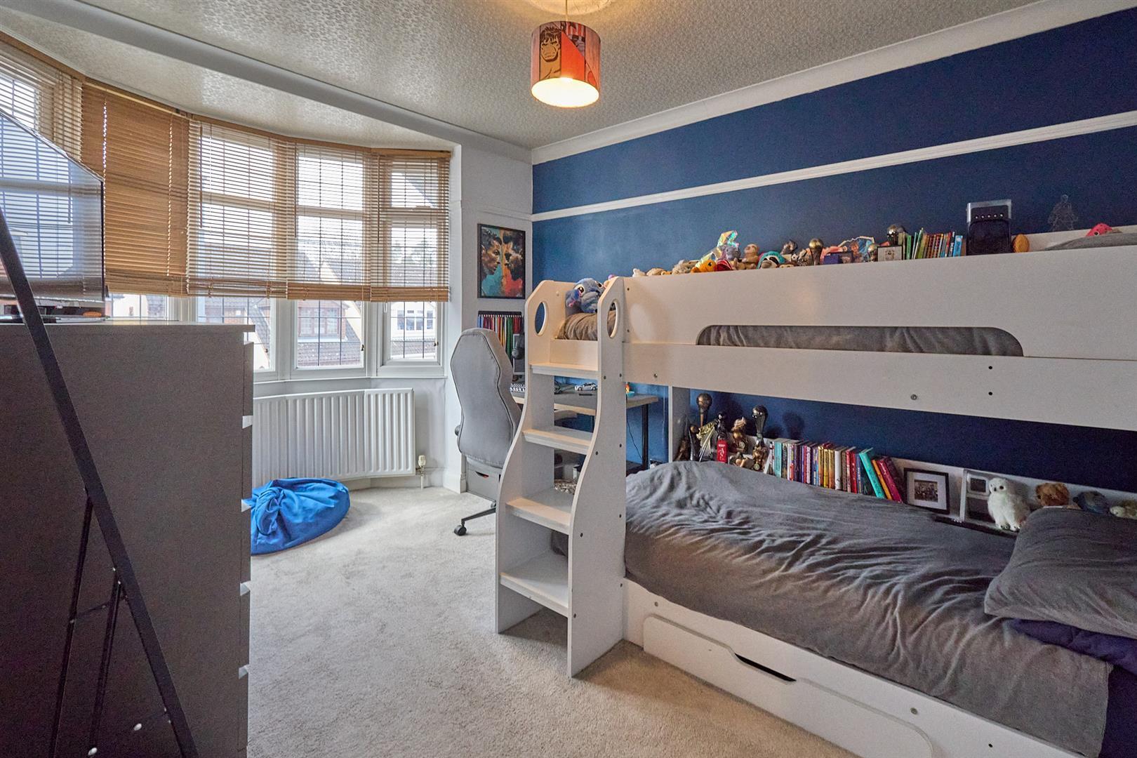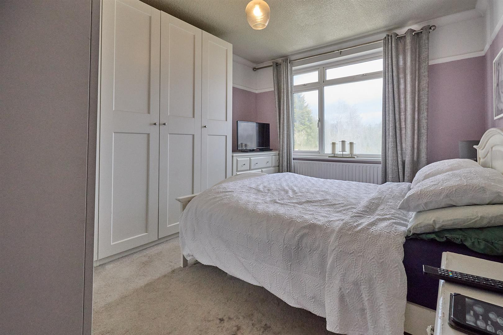 With a range of bedroom furniture in white consisting two double, one corner and one single wardrobe unit, single panel radiator, coving to ceiling.