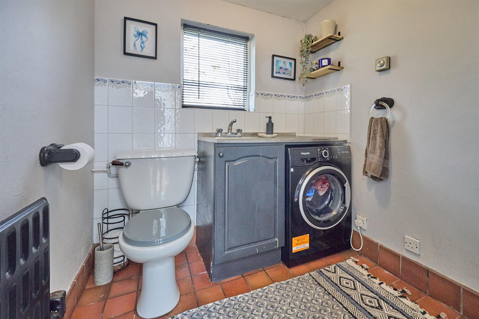 With single drainer stainless steel sink unit cupboard beneath, tiled splashbacks, appliance recess points, plumbing for automatic washing machine, white low level WC, quarry tile flooring, radiator with Frost Stat.