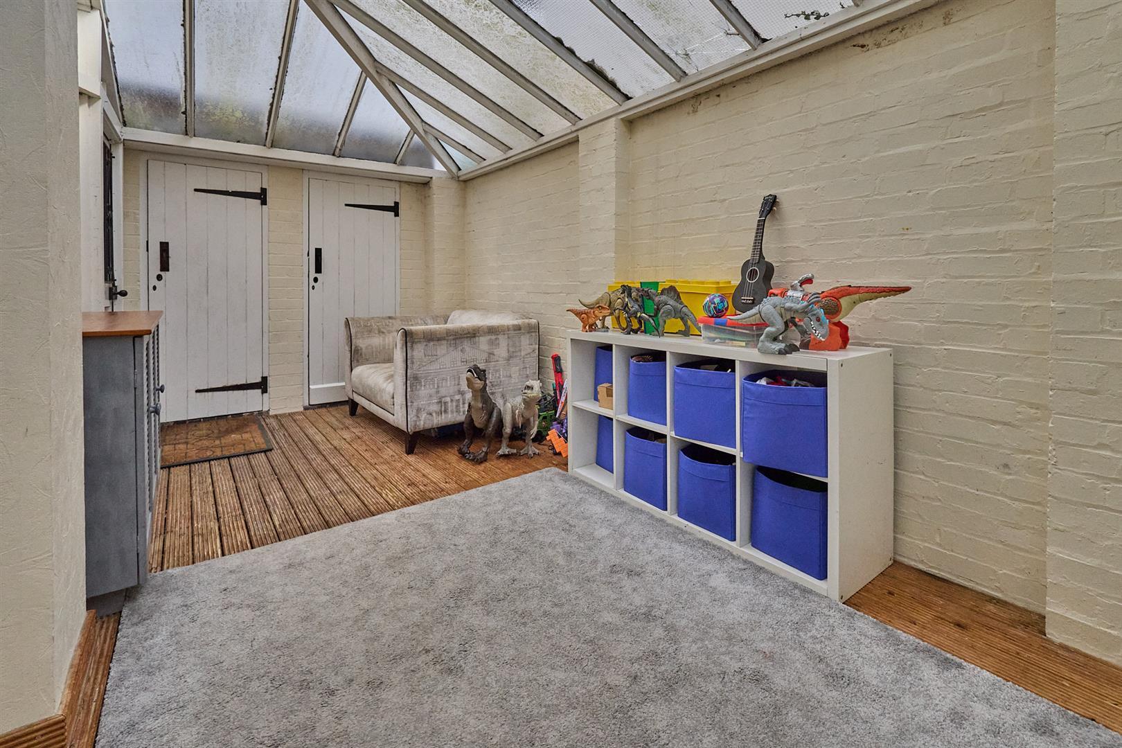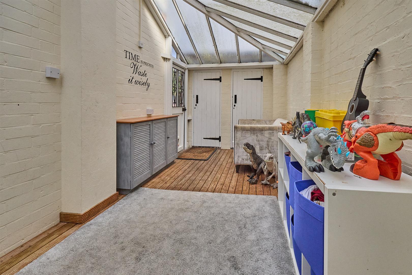 With wood strip flooring, built in storage cupboards, communicating door to the garage, wood and glazed door leading to the rear garden, further door to