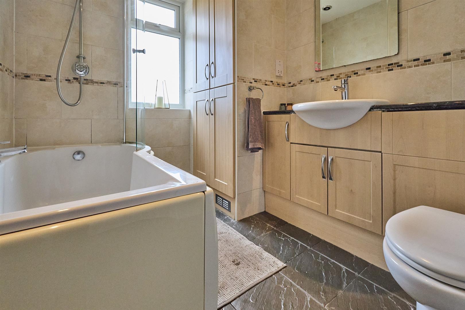 With white suite consisting of a P shaped panel bath, mains shower unit above shower screen to side, vanity sink with beach double cupboard beneath, low level WC, contrasting fully tiled surrounds including the flooring, chrome heated towel rail, inset ceiling spotlights. Full height double airing cupboard in beech housing the Worcester gas combination boiler for central heating and domestic hot water (new as of 2025 still under warranty).