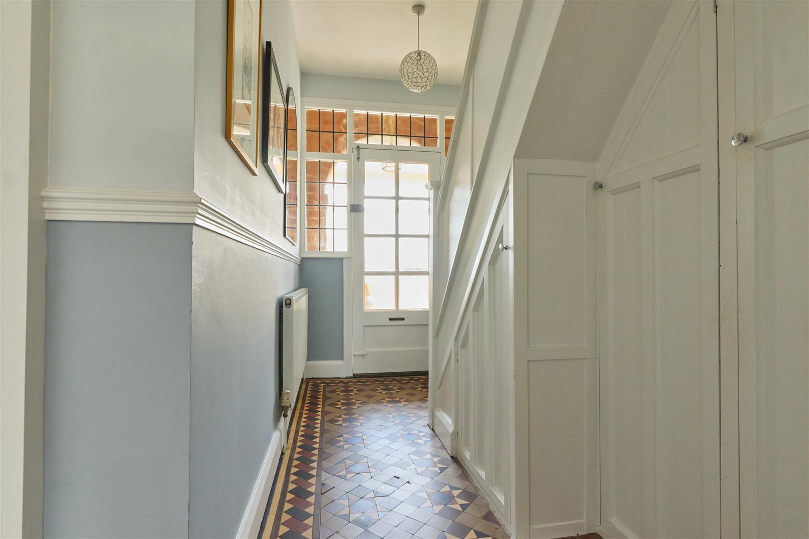With original Victorian tiled flooring, single panelled radiator, Dado rail, smoke alarm. Timber door to under stairs storage cupboard housing the fuse board and gas and electric meters. Door to