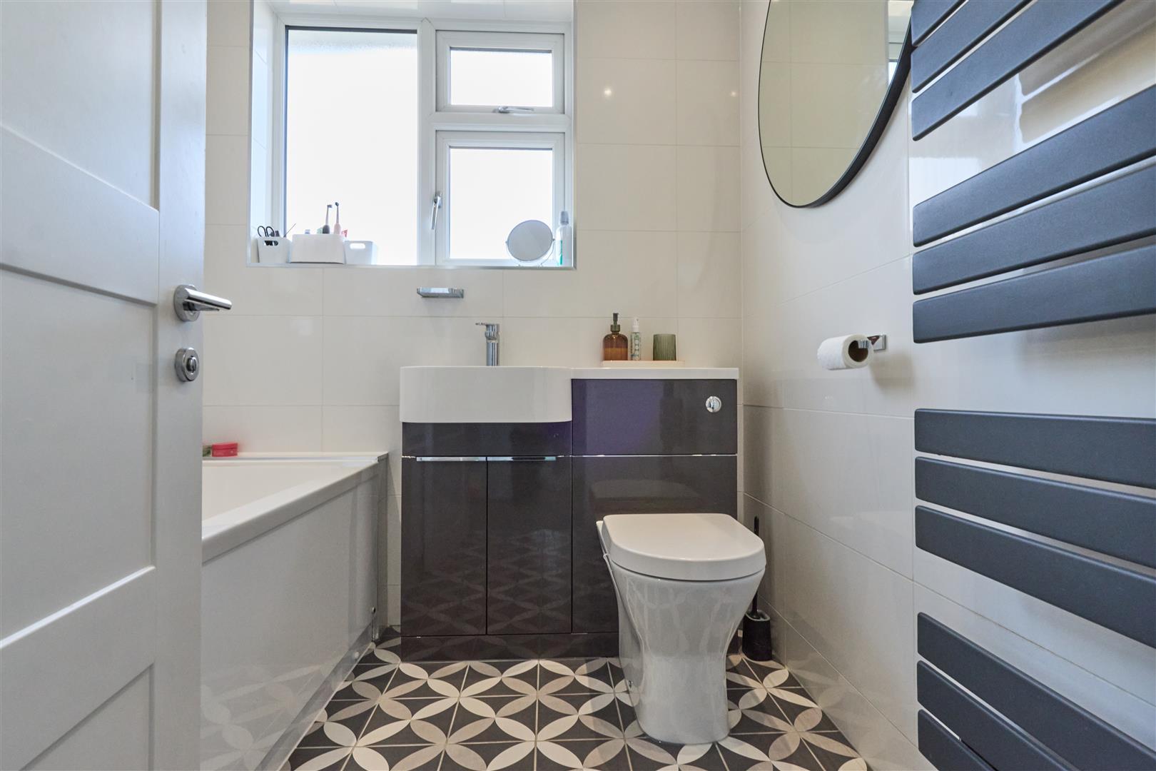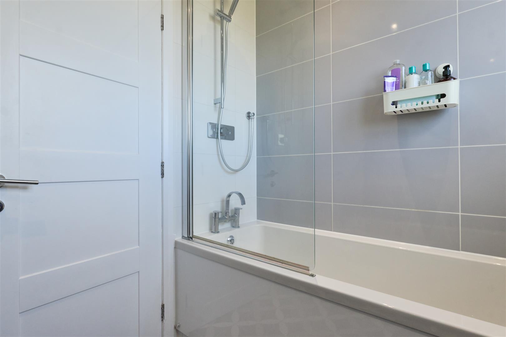 With tiled flooring, combination vanity unit with low level WC, wash hand basin with storage beneath, chrome taps above. Panelled bath with chrome taps, bar shower above with hand attachment and glazed shower screen, tiled surrounds and extractor fan. Inset ceiling spotlights, fashionable upstanding grey towel heater.