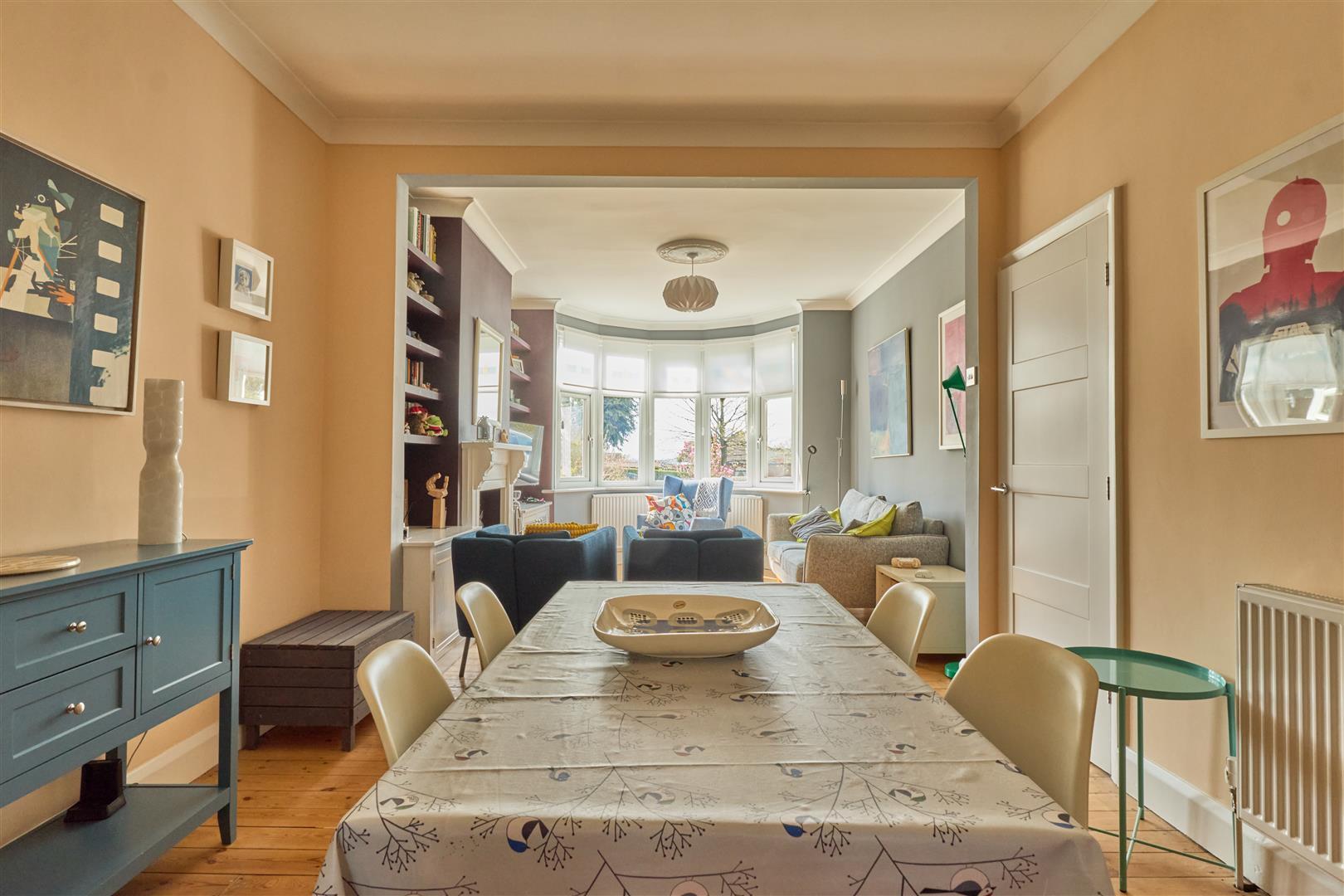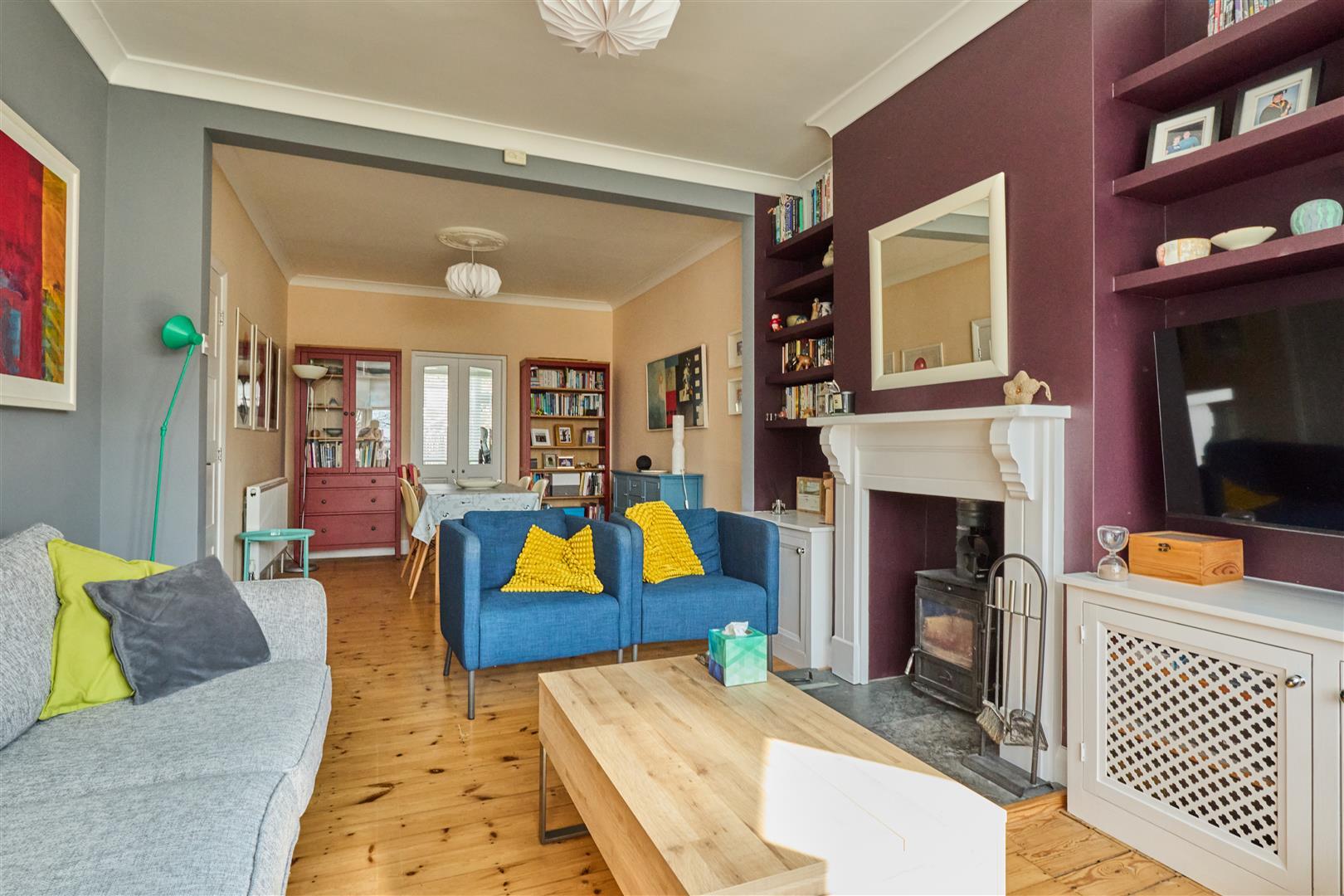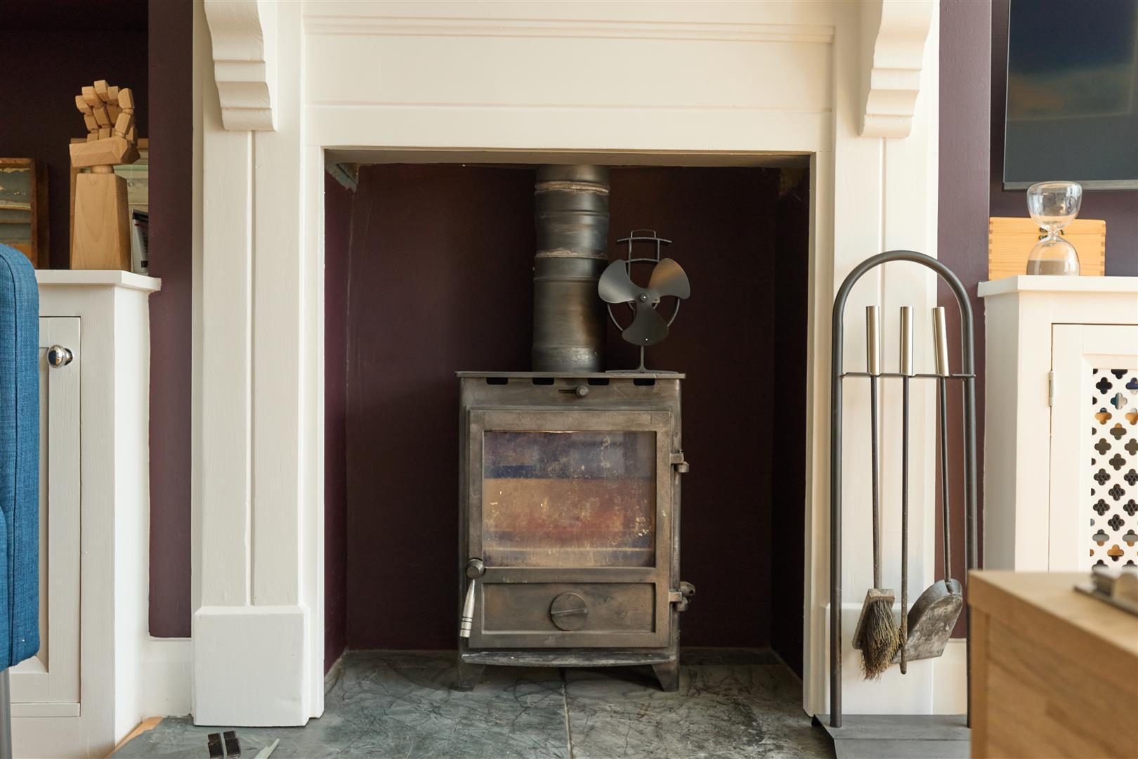 With original pine floorboards, single panelled radiator, bay window to front. Bespoke cupboards and shelving within the alcove housing the TV aerial point and shelving. Coving to ceiling, feature fireplace with timber mantle and slate hearth incorporating a multi fuel burner. Door to