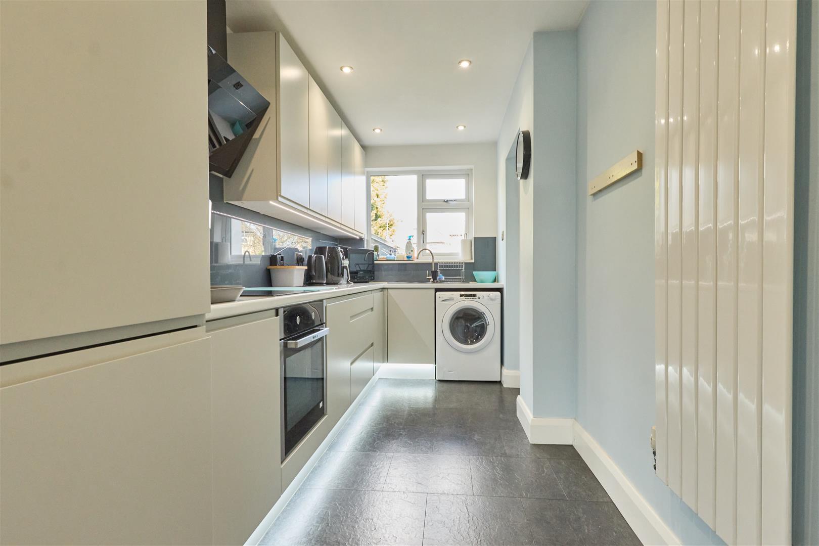 With tile effect laminate tiles, inset ceiling spotlights, fashionable upstanding radiator. A range of floor standing matt grey handle less kitchen cupboard units with white stone effect working surfaces, Blomberg built in oven and four ring electric hob and extractor hood above, built in fridge freezer. Black inset resin drainer sink with brushed chrome handles, further matching range of wall cupboard units, one housing the Baxi combination boiler for domestic hot water and gas central heating, LED lighting beneath the floor standing units and wall cupboard units. Aluminium splashback.