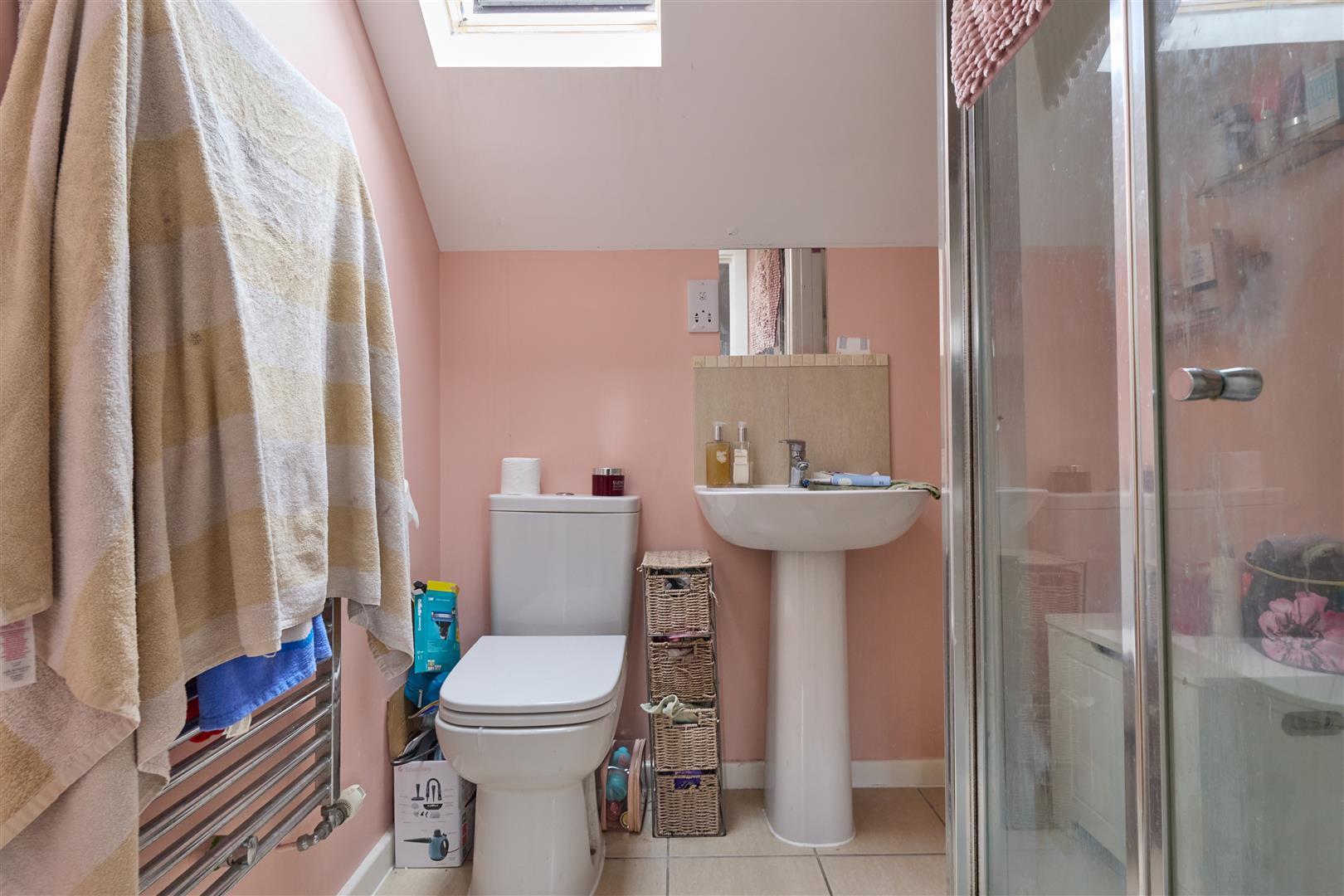 With white suite consisting fully tiled shower cubicle with glazed shower doors, pedestal wash hand basin, low level WC, contrasting tiled surrounds including the flooring, chrome heated towel rail, extractor fan, double glazed Velux window, shaver point.
