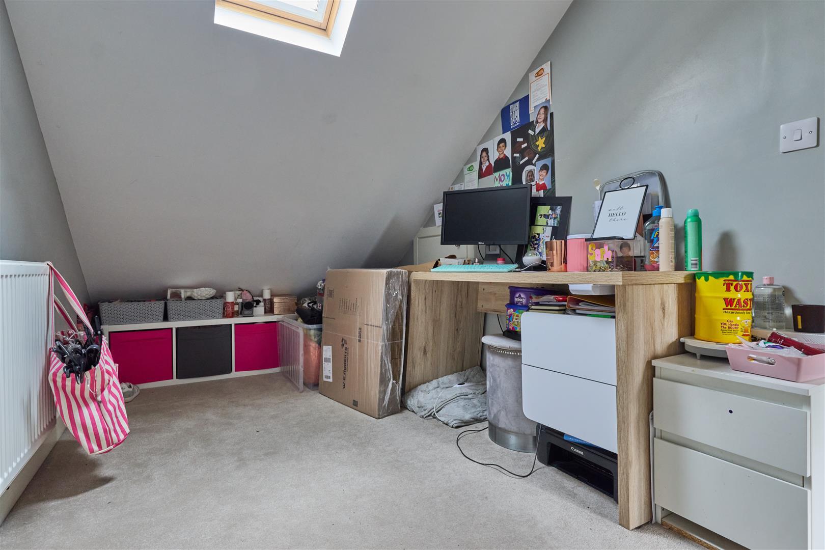 An area curently used as a home office with wired in smoke alarm, a low level door to large storage cupbaord, velux window.