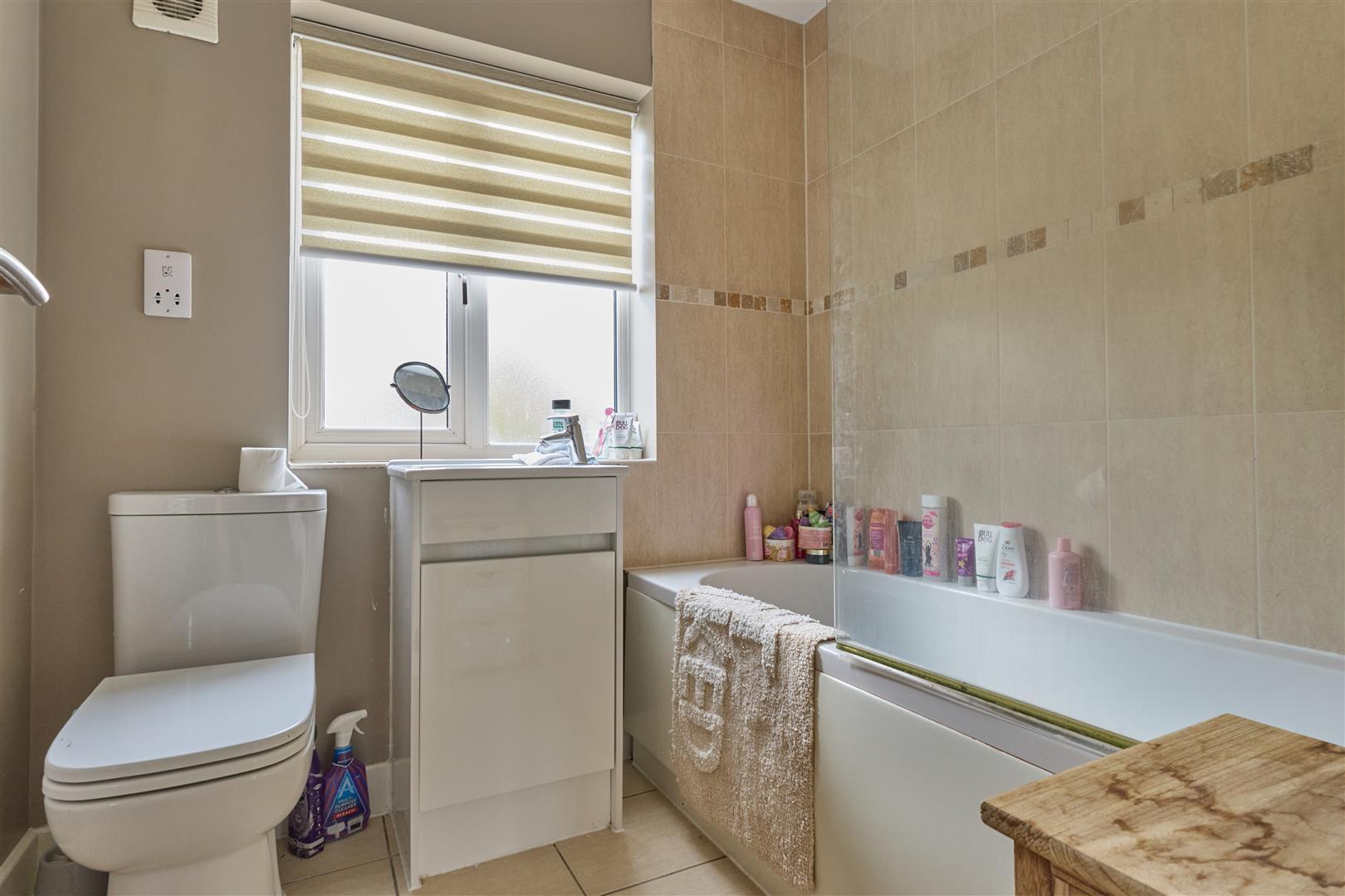 With white suite consisting panelled bath, main shower unit above, glazed shower screen to side, vanity sink with gloss white cupboard beneath, low level WC, contrasting tiled surrounds including the flooring, chrome heated towel rail, inset ceiling spotlights and extractor fan.