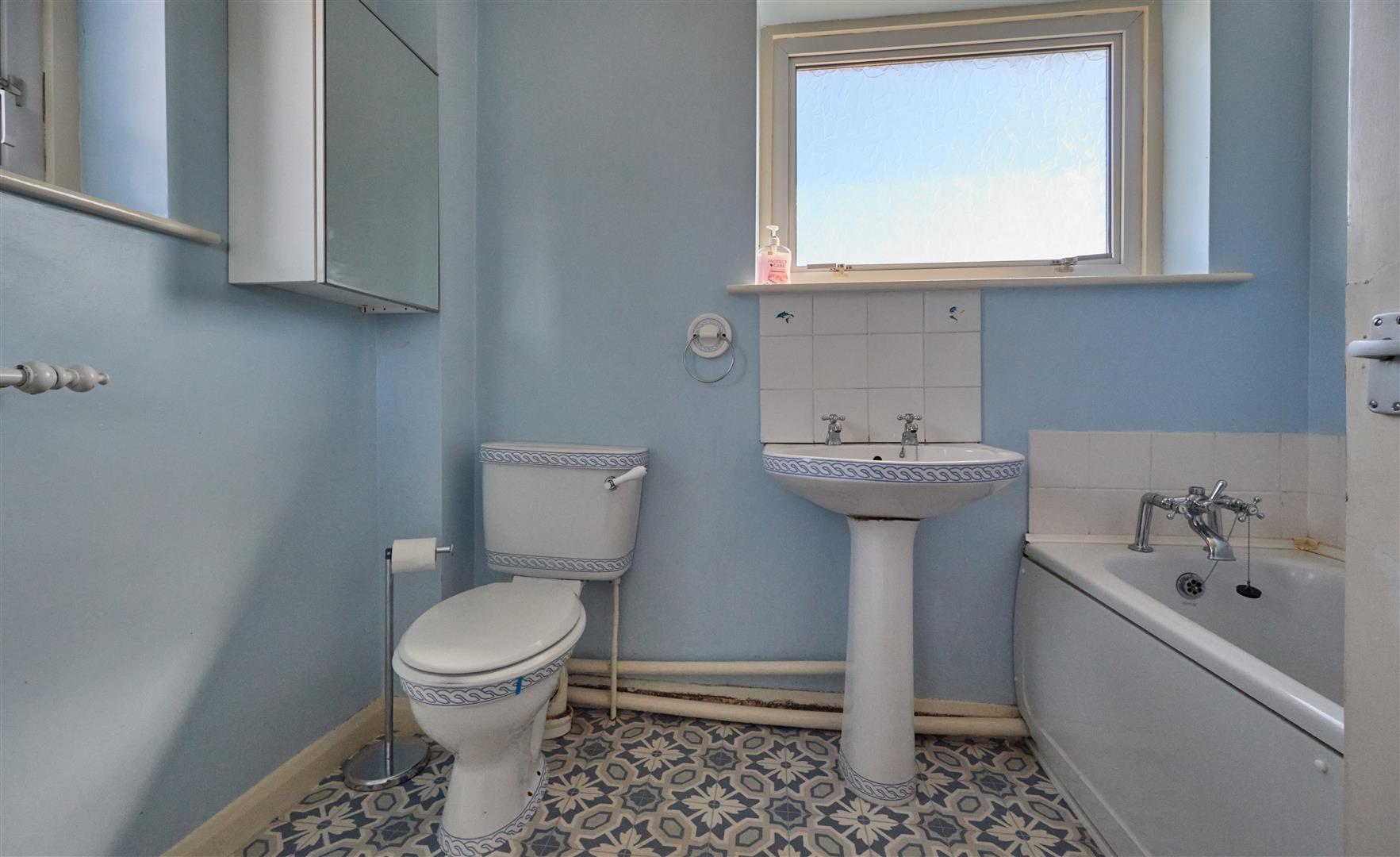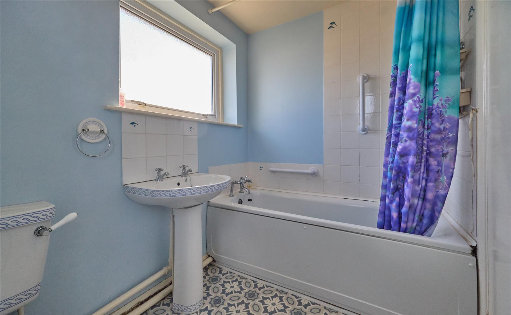 With a white panelled bath with mixer tap and shower attachment, low level WC, pedestal wash hand basin, radiator, vinyl flooring and wall mounted cupboard unit.