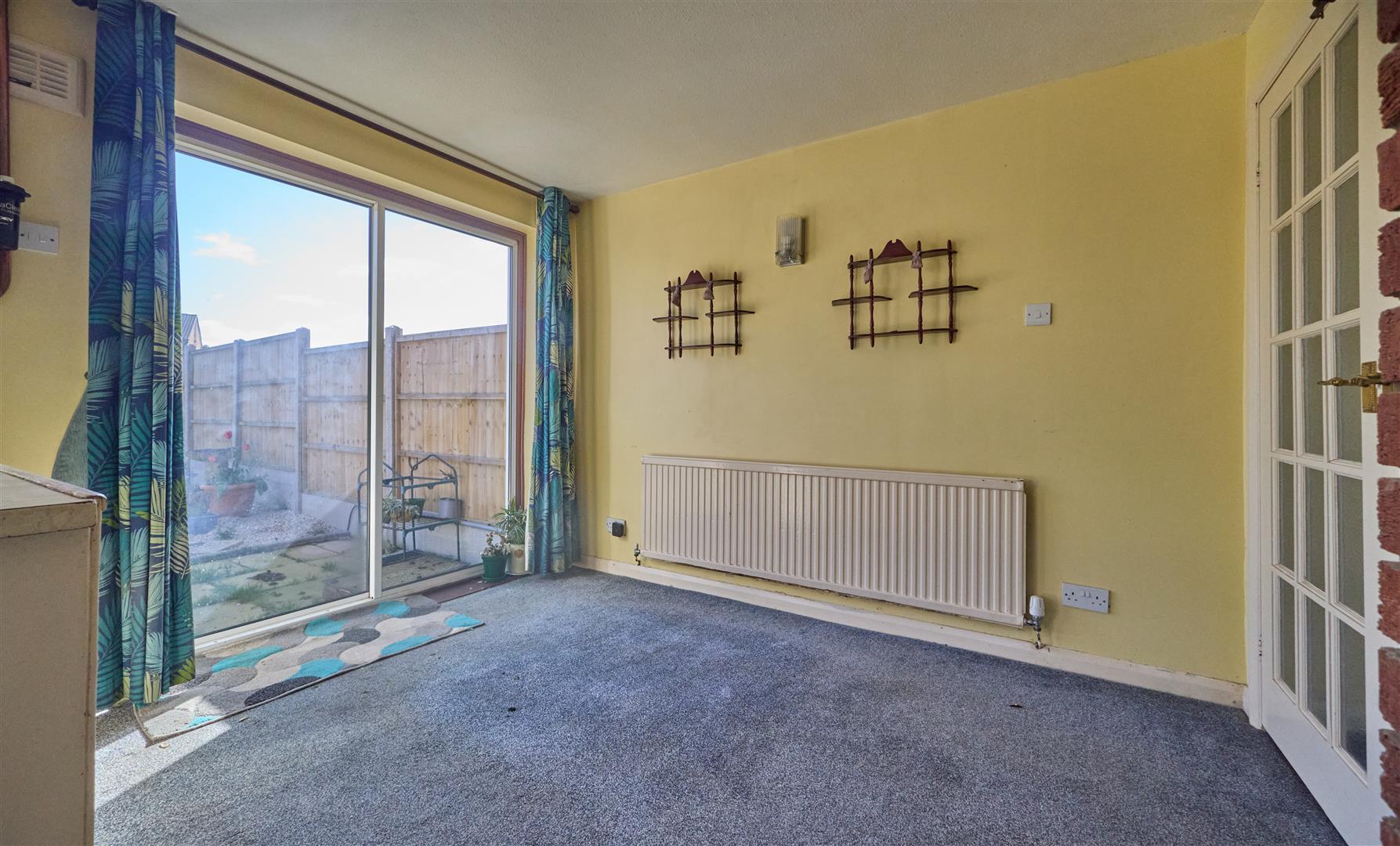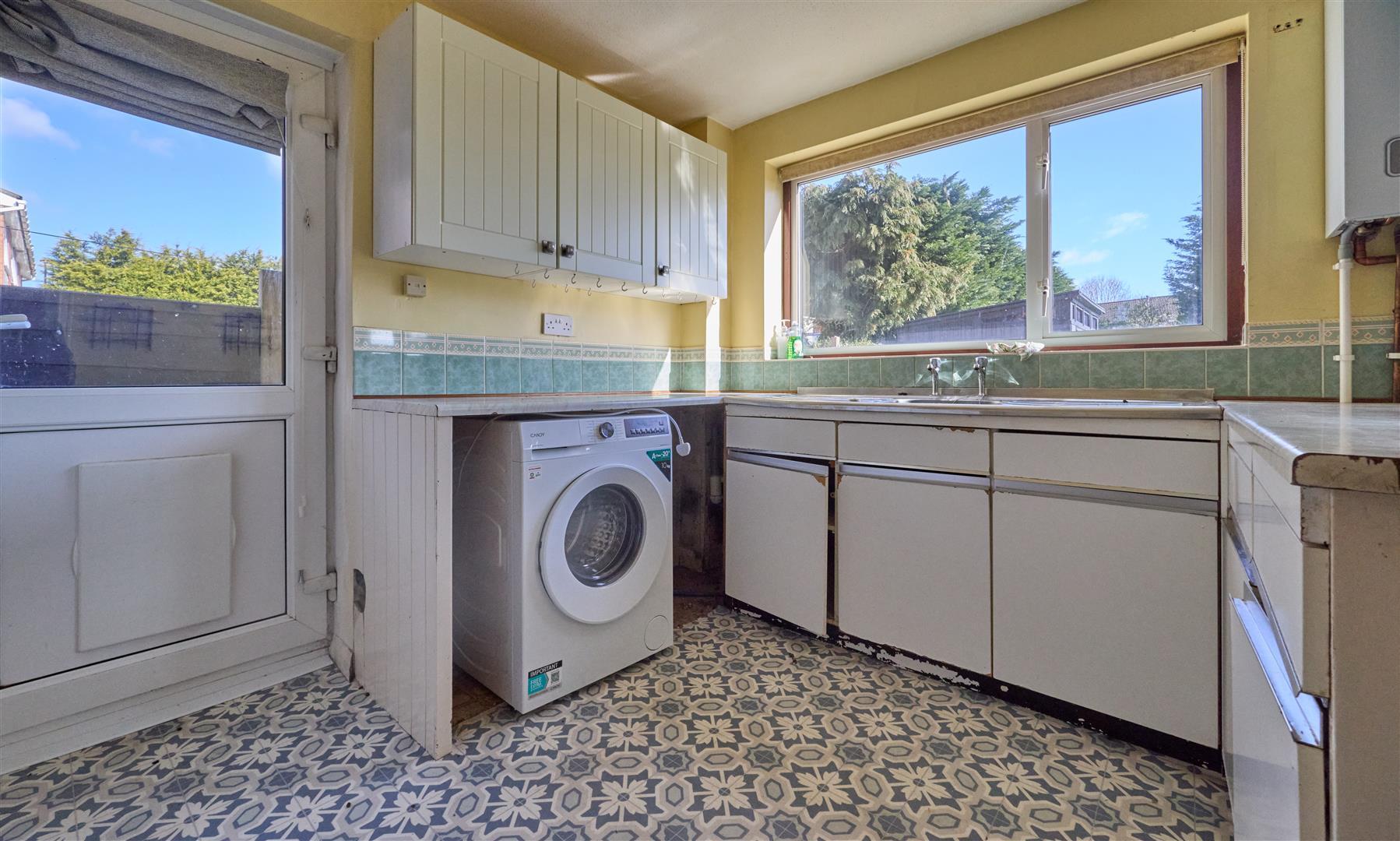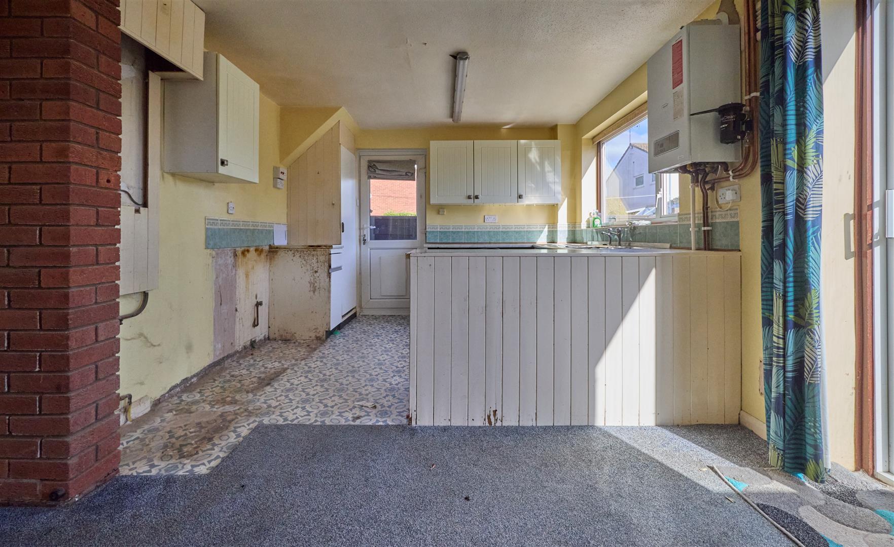 With a range of floor standing units with roll edge working surfaces above and inset stainless steel sink with mixer taps, appliance recess points. Tiled splashbacks. A further range of matching wall mounted cupboard units, one tall larder unit, vinyl flooring, wall mounted gas boiler and radiator. UPVC SUDG sliding door to and a further UPVC SUDG side door to the rear garden.