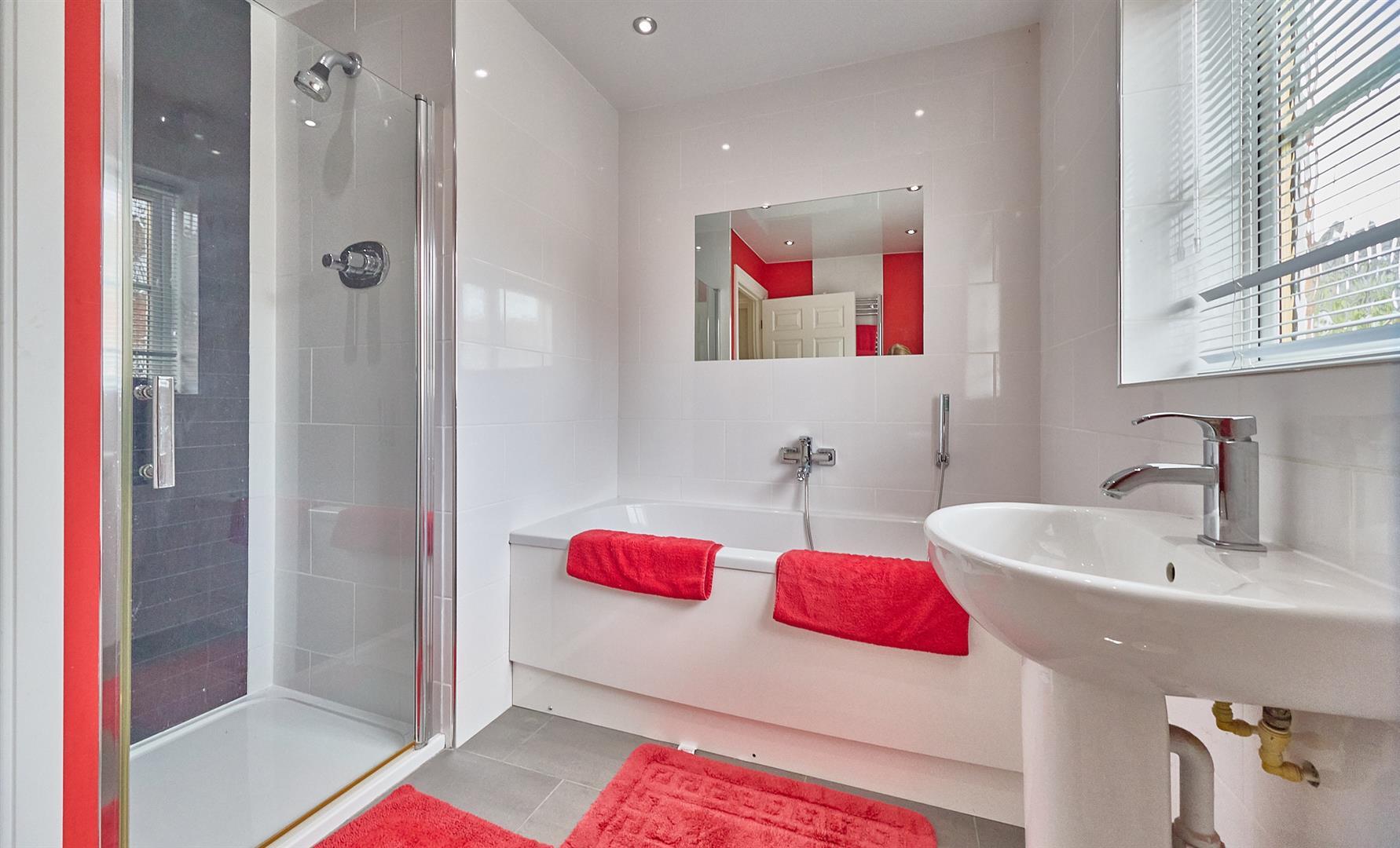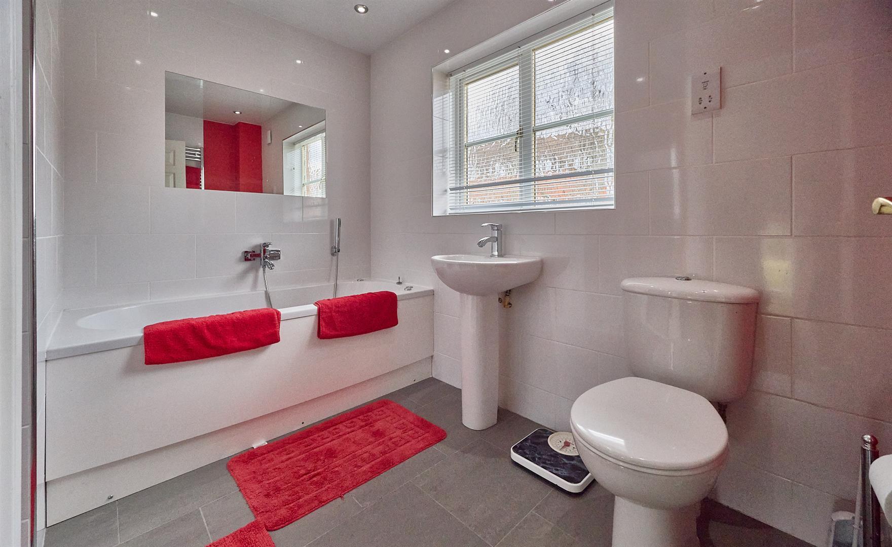With a four piece suite consisting of a white panelled Jacuzzi bath with mixer tap and shower attachment, pedestal wash hand basin with mixer tap, low level WC, and a fully tiled shower cubicle with main shower attachments. Fully tiled surrounds, inset ceiling spotlights, tiled flooring, chrome heated towel rail, shaver point and extractor fan.