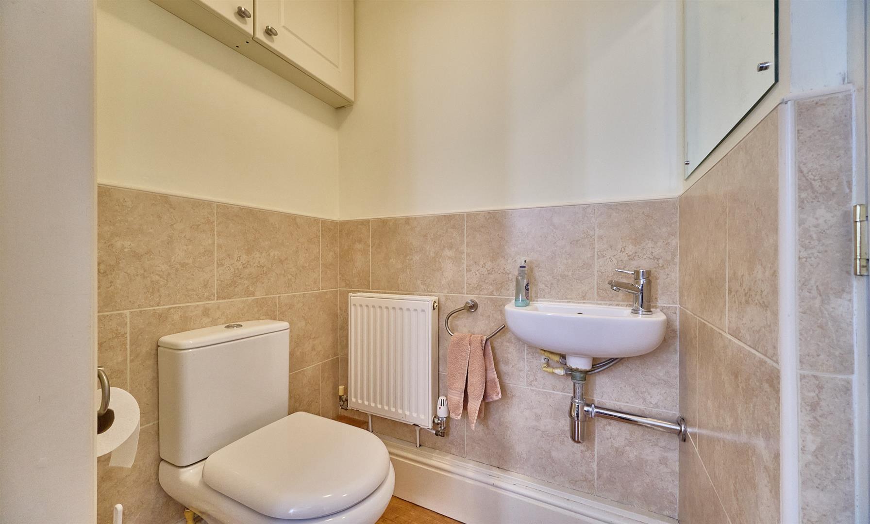 With low level WC, wall mounted sink unit, laminate wood strip flooring, radiator, wall mounted storage cupboard. Door to a full height storage cupboard.