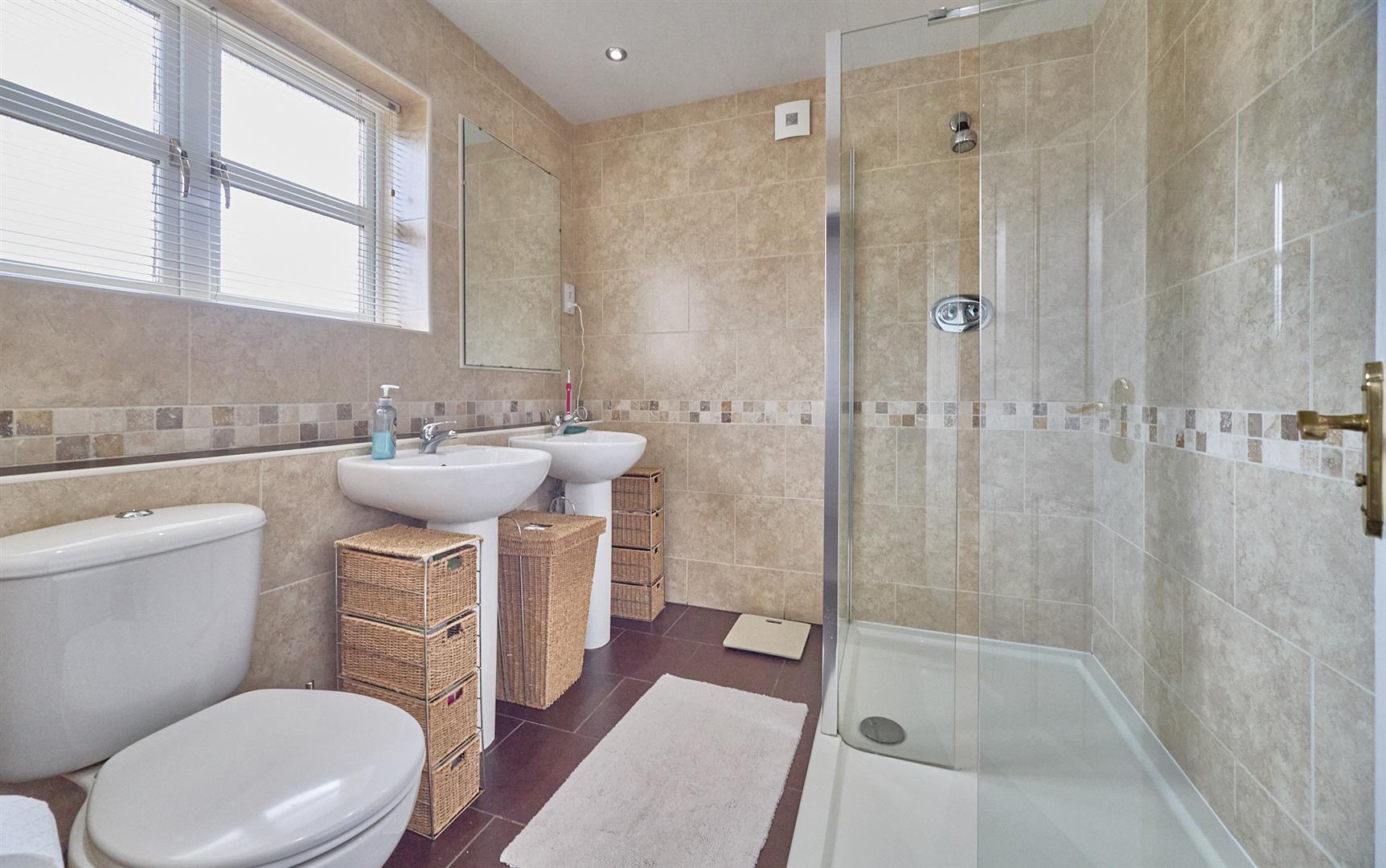 With a large walk in shower cubicle with main shower attachment and glazed shower screen surrounding, low level WC, two pedestal wash hand basins with mixer taps and fully tiled surrounds. Tiled flooring, wall mounted mirror, inset ceiling spotlights, chrome heated towel rail and extractor fan.