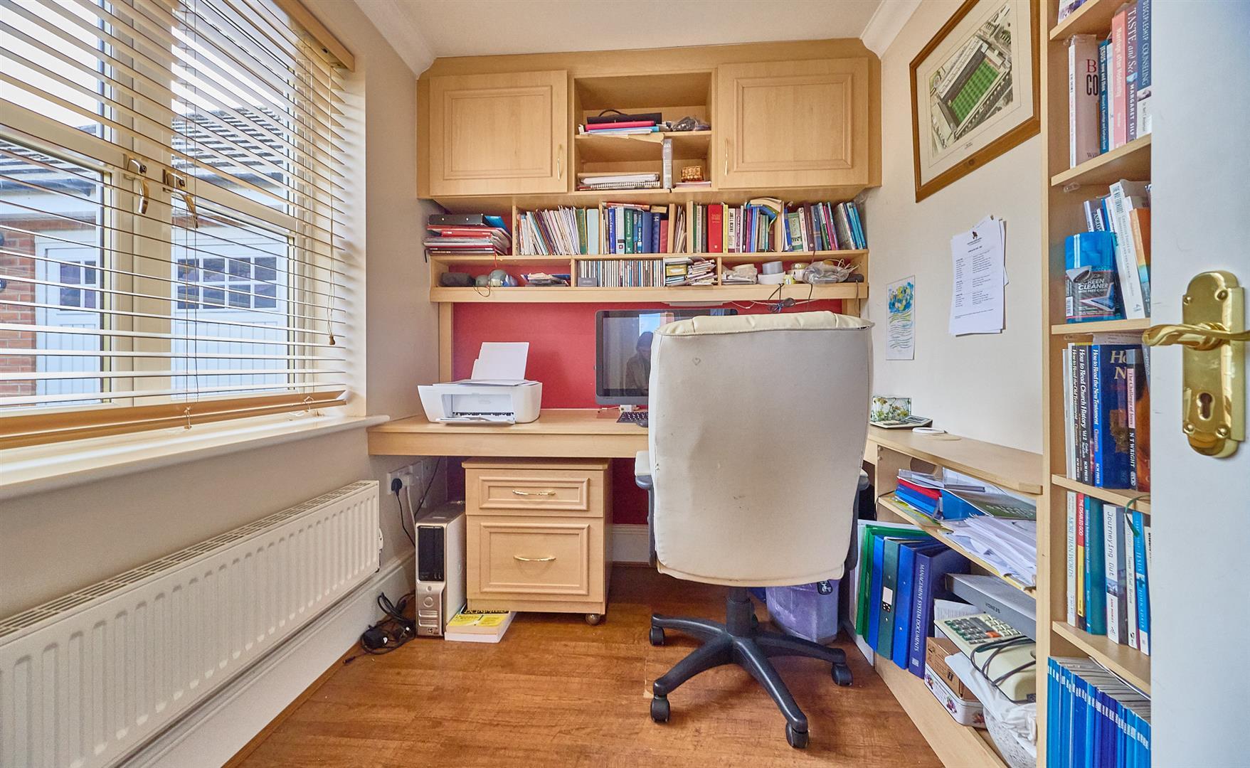 With a radiator, laminate wood strip flooring and a range of fitted office furniture consisting of a desk, shelving and wall mounted cupboards.