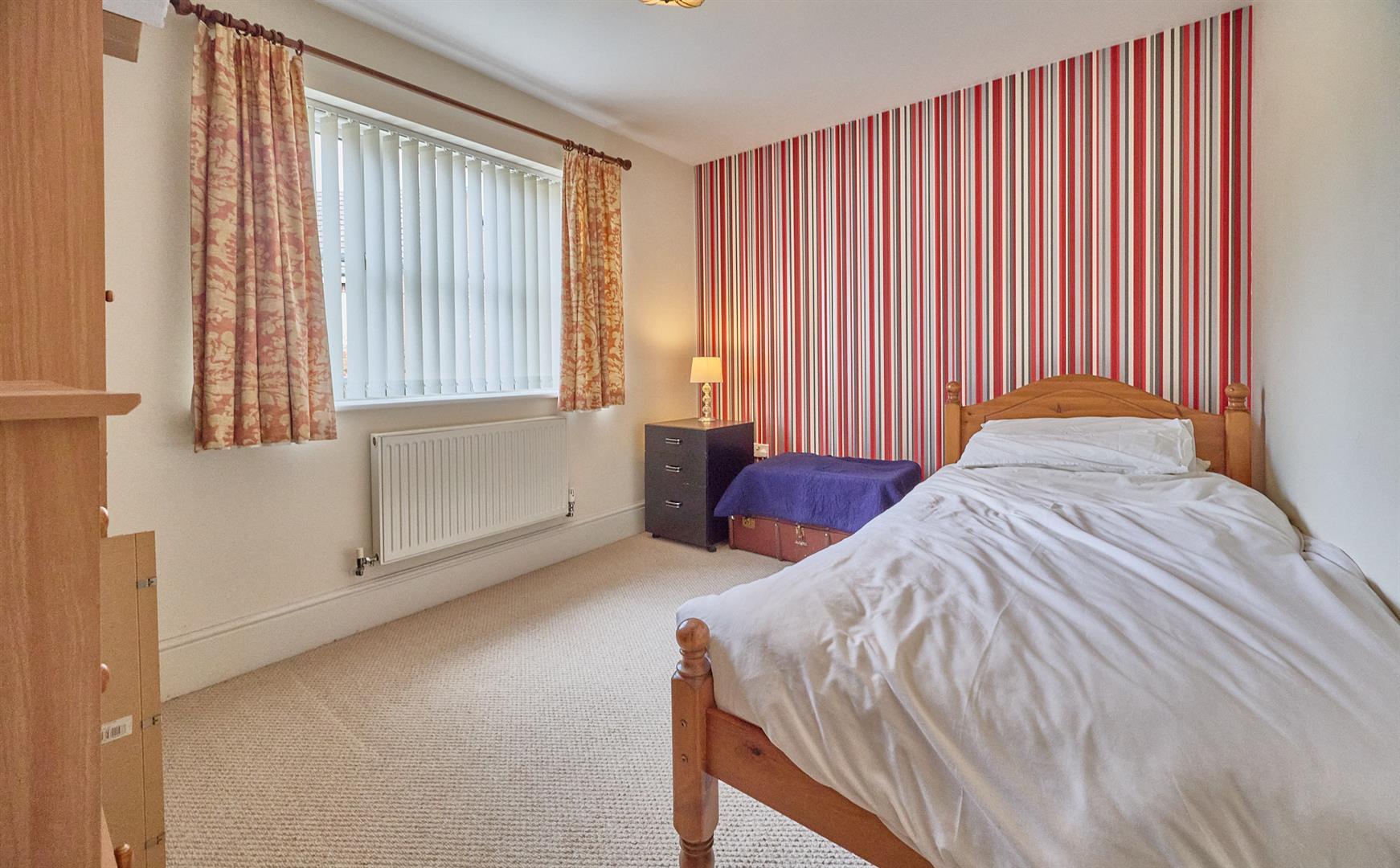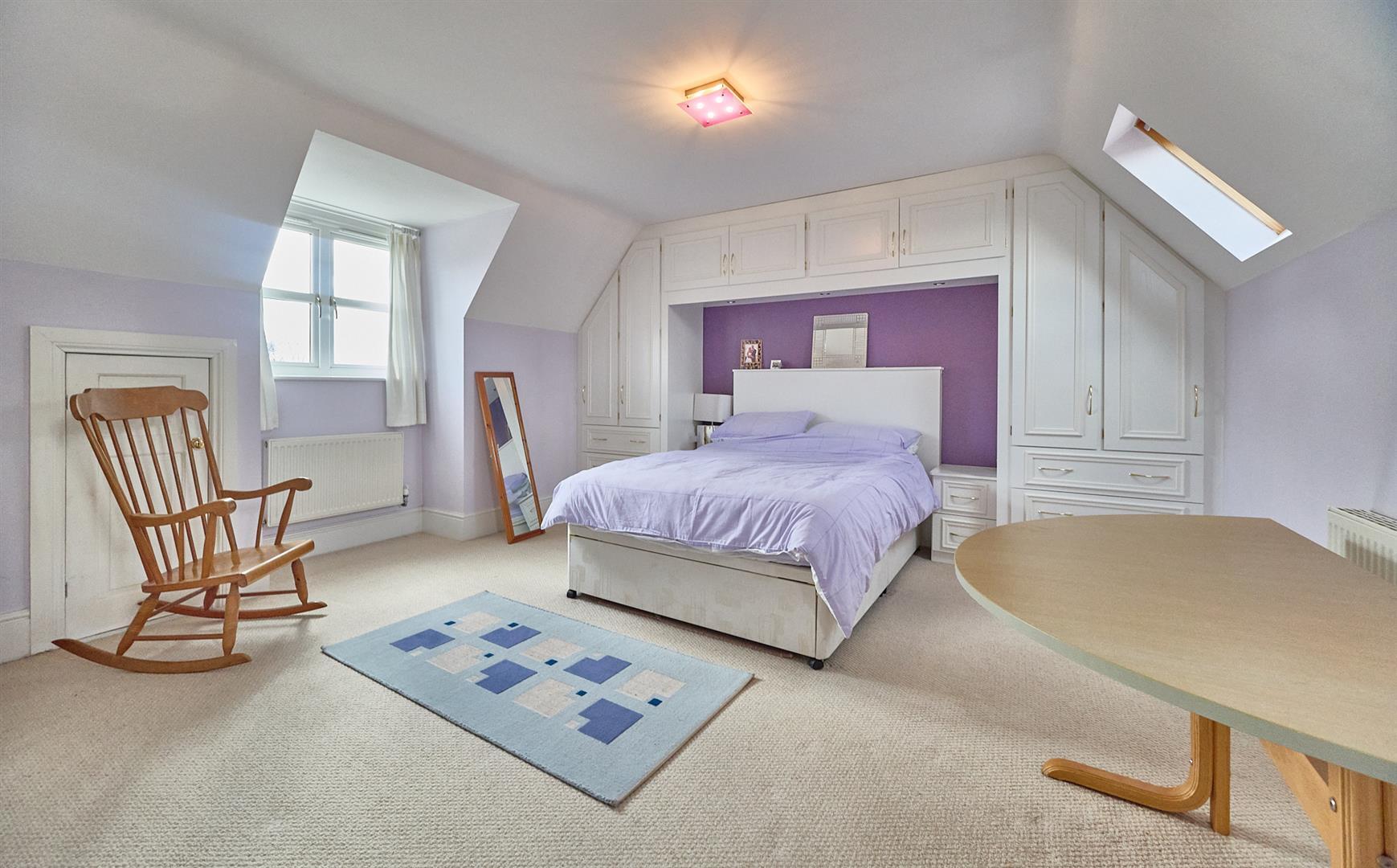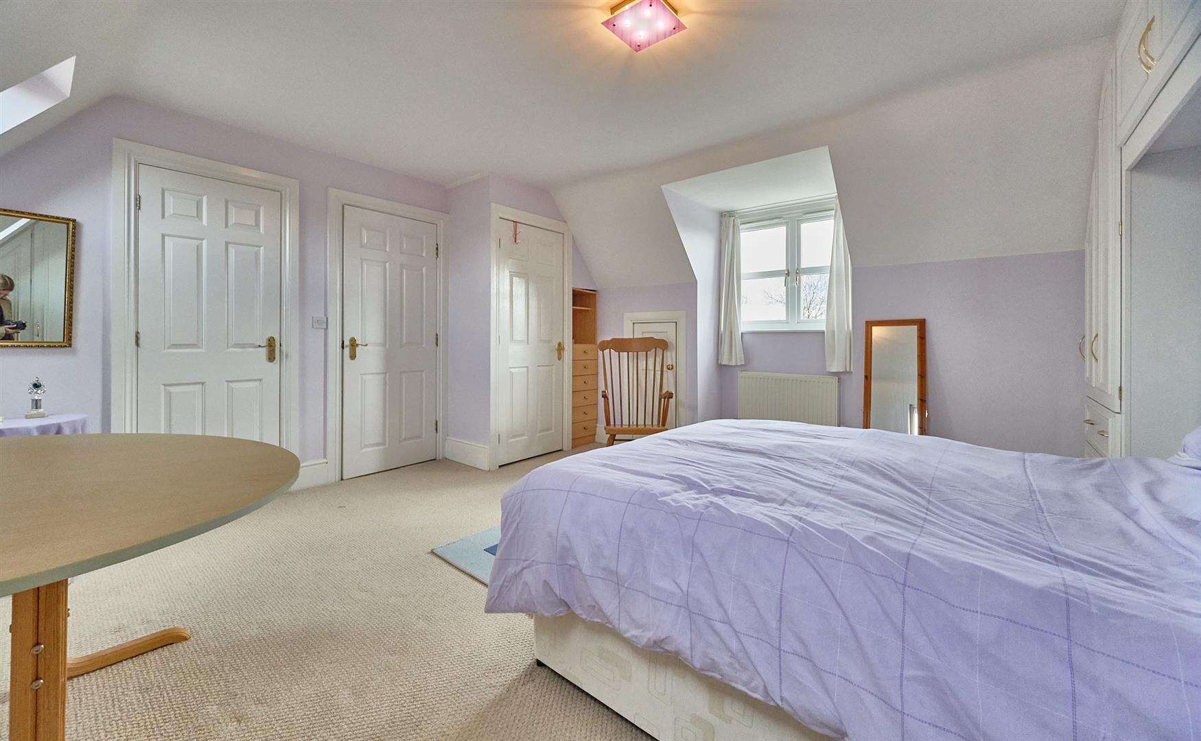 With a range of fitted bedroom furniture consisting of four single wardrobe units with matching drawers, a matching range of cupboards above the bed head and matching bedside tables. Two doors offering access to the storage in the eaves. A further white panelled interior door leads to a storage cupboard. Two radiators, two Velux windows and white panelled interior door to