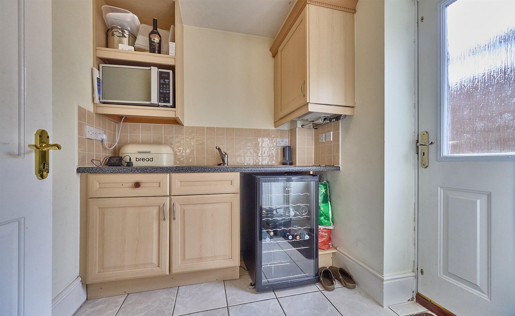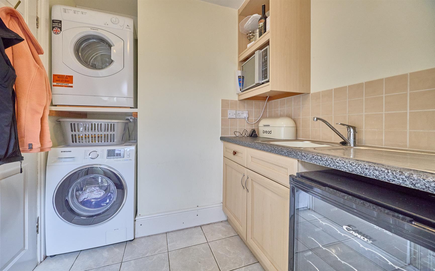 With floor standing units matching the kitchen with roll edge working surface above, inset stainless steel drainer sink with mixer tap and one wall mounted cupboard unit housing the Worcester gas boiler. A further matching wall shelving unit. Space for a washing machine and tumble dryer, tiled flooring, radiator and a door to the side of the property.