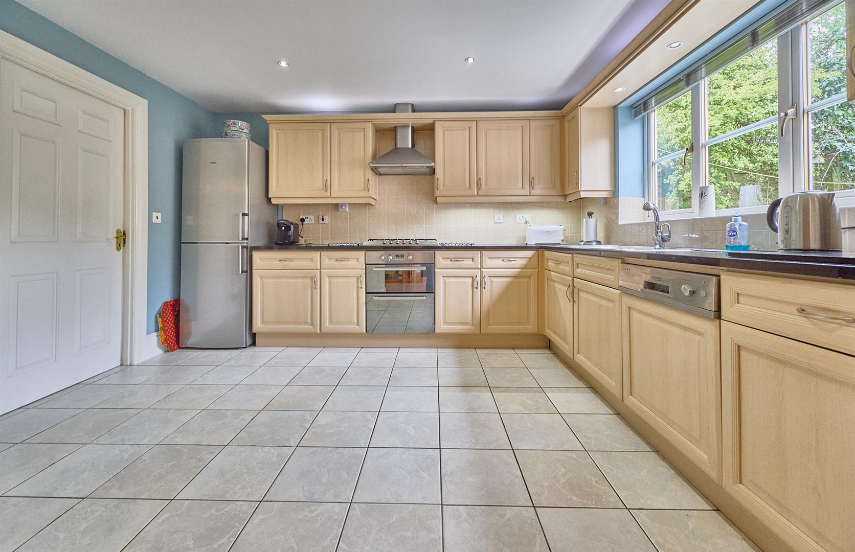 With a range of floor standing kitchen units with black granite working surface above, inset one and a half bowl stainless steel drainer sink with mixer tap, double oven with five ring gas hob and extractor above. Integrated dishwasher, space for a fridge freezer and tiled splashbacks. A further matching range of wall cupboard units, with inset spotlights above the sink. Tiled flooring, inset ceiling spotlights, radiator and white panelled interior door to