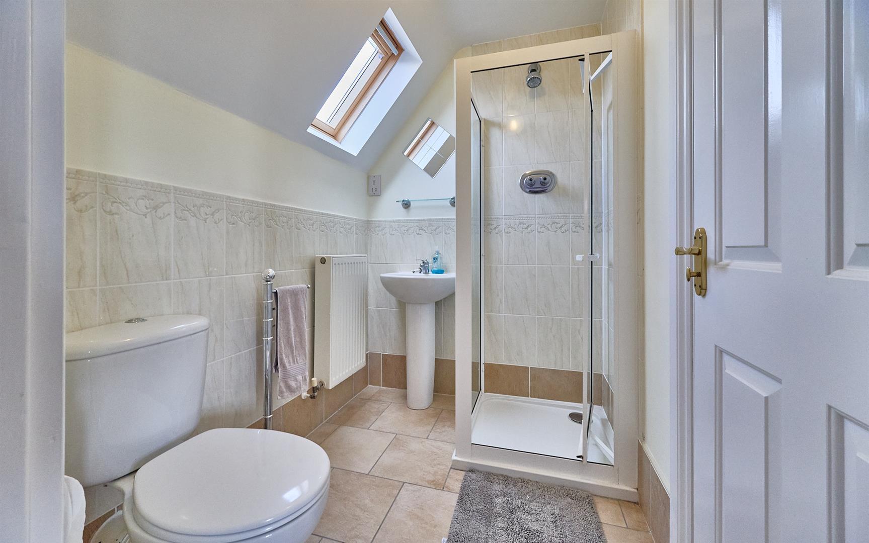 With a fully tiled shower cubicle with main shower attachment, low level WC and pedestal wash hand basin. Half tiled surrounds, tiled flooring, radiator, Velux window, extractor fan. A further white panelled interior door leads back to the landing.