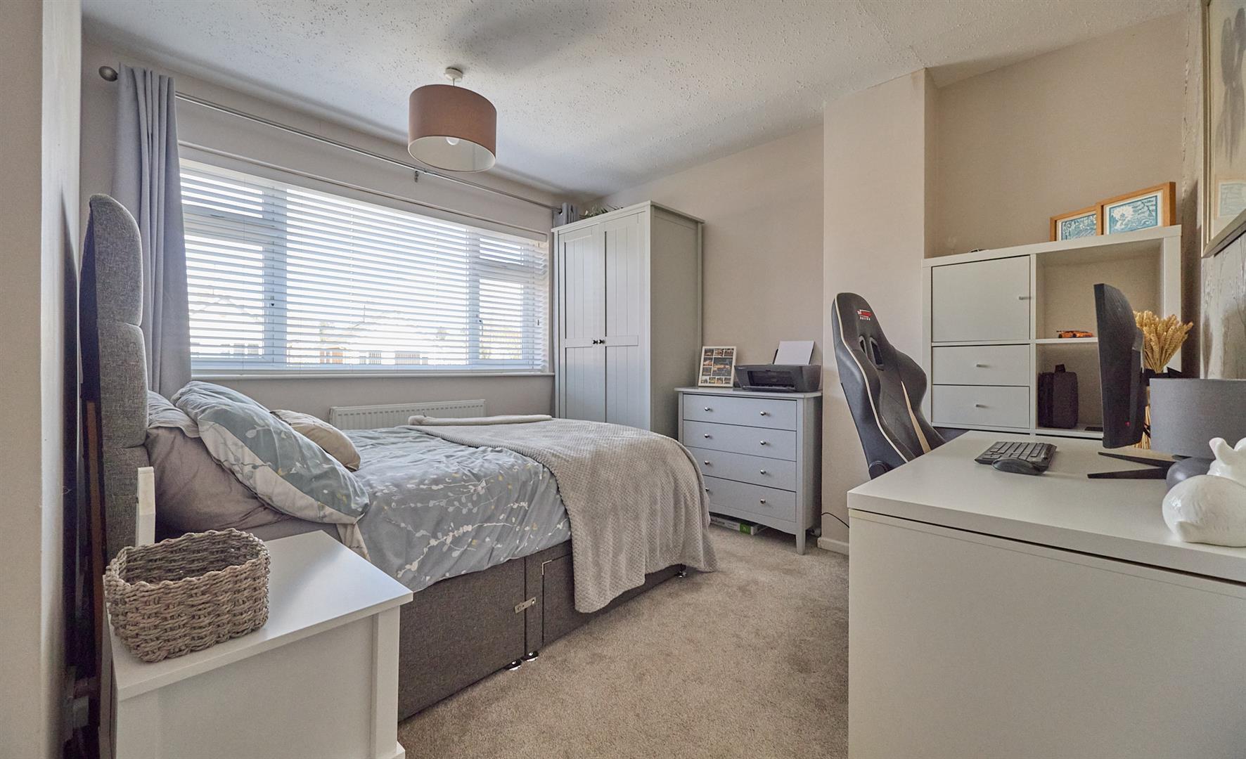 With a range of fitted bedroom furniture consisting of four double wardrobes and radiator.