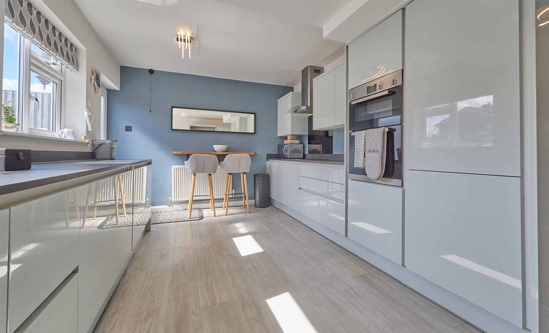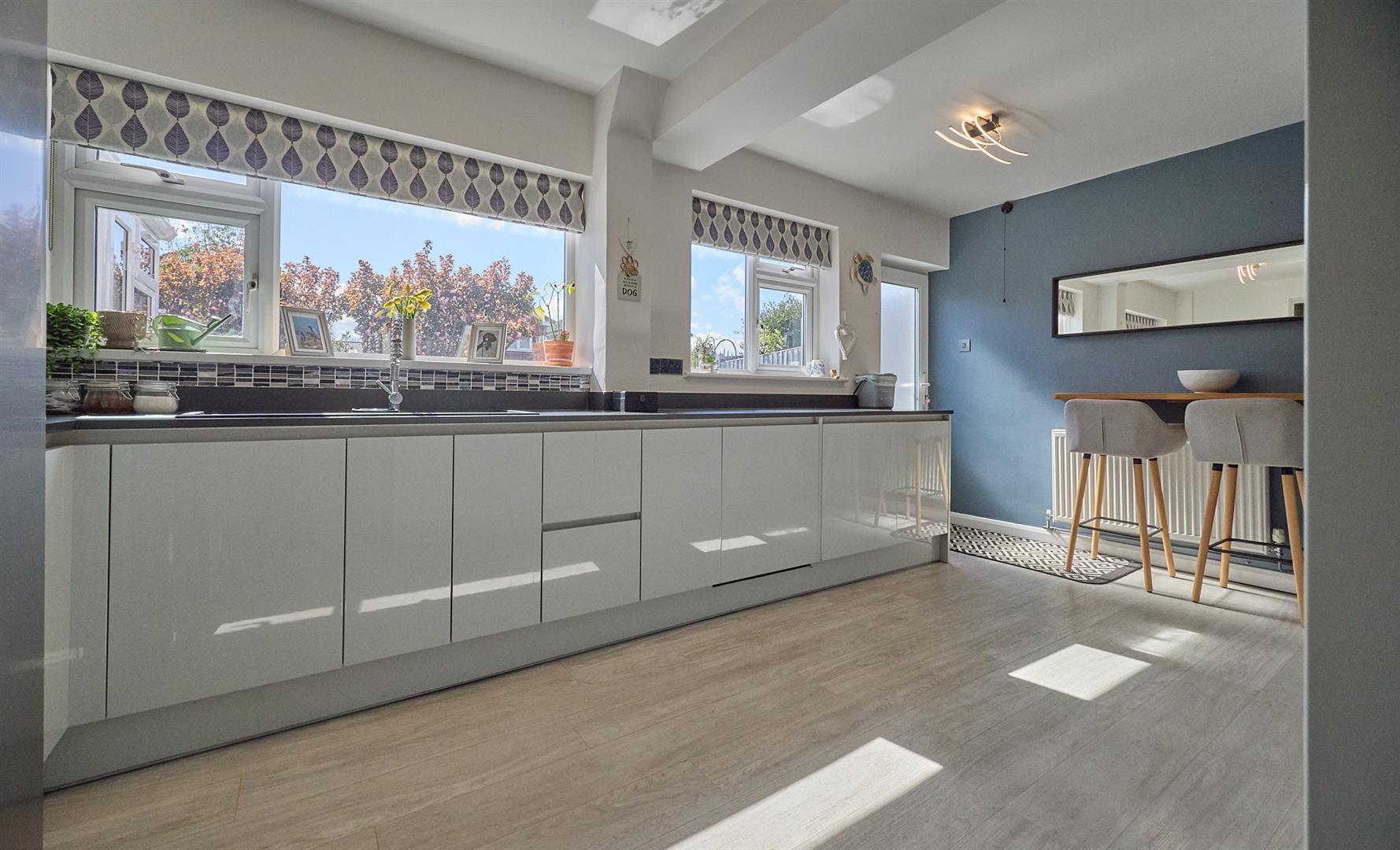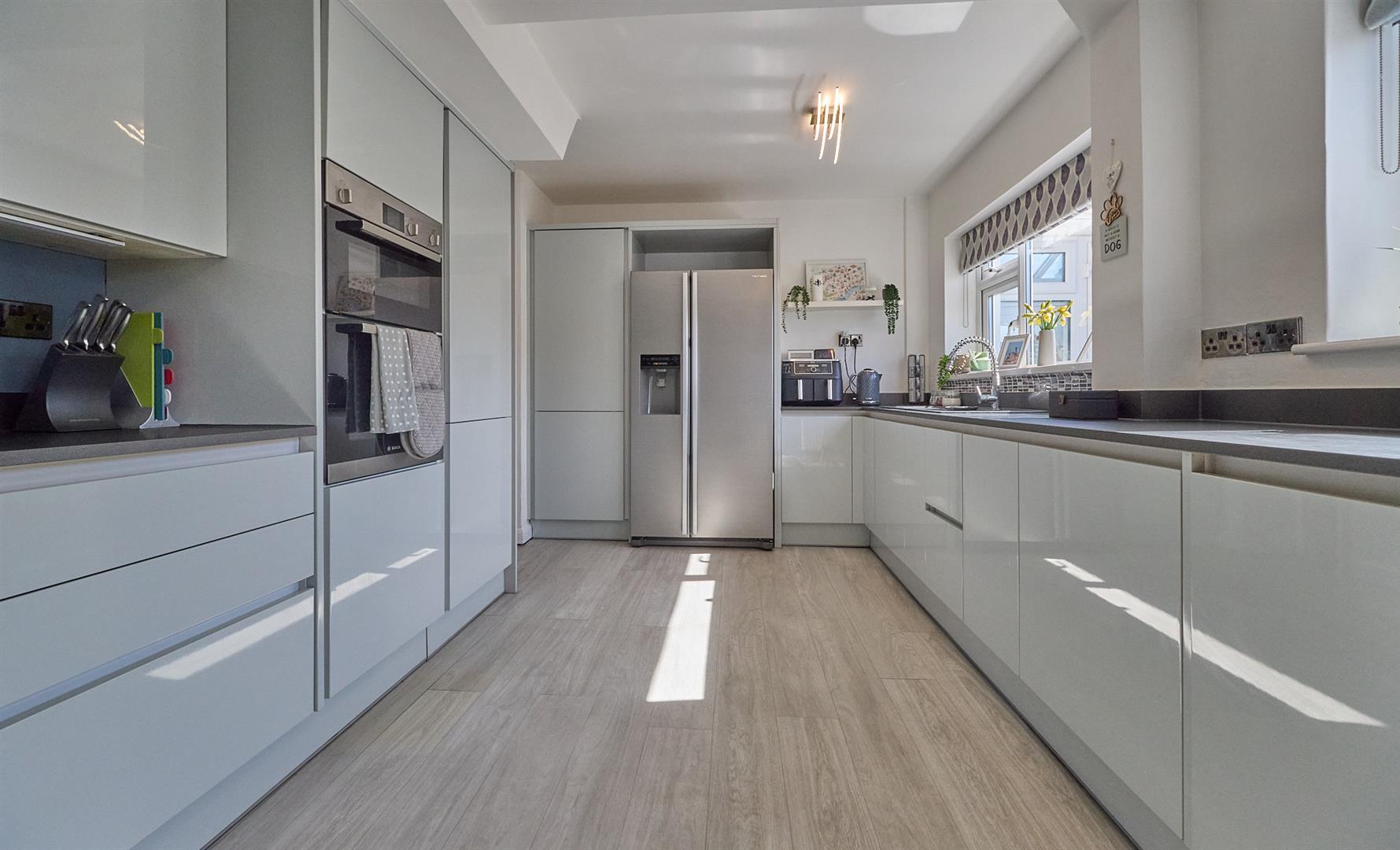 With a range of floor standing fitted kitchen units with working surface above and inset black composite one and half bowl drainer sink with mixer tap. A range of integrated appliances include, double oven, induction hob with extractor above, dishwasher, washing machine and fridge freezer. Further range of matching wall mounted cupboard units. Two tall larder cupboard units. Wall mounted breakfast bar. Radiator, laminate wood strip flooring and UPVC SUDG door to the rear garden.