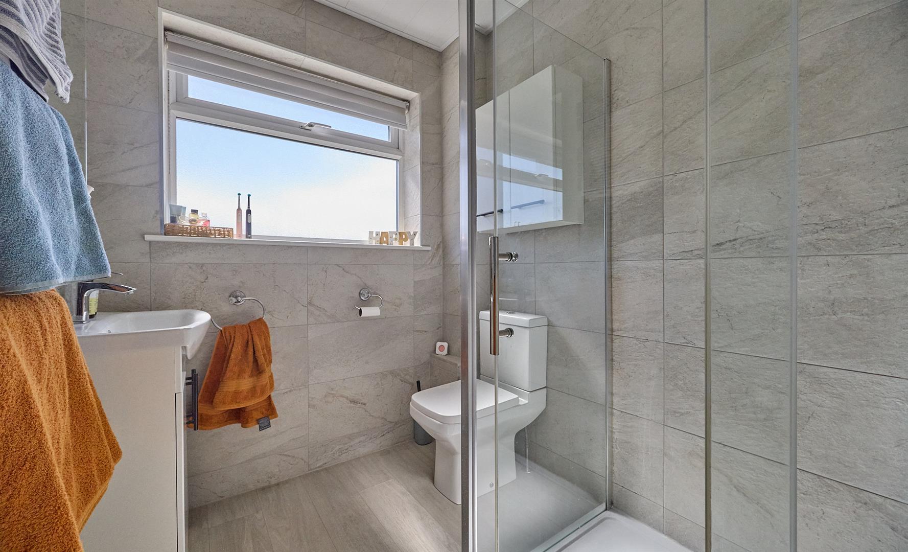 With fully tiled shower cubical with rainfall shower attachment and sliding shower door, low level WC and vanity sink unit with double cupboard beneath. Illuminated wall mounted mirror, grey heated towel rail, inset ceiling spot lights, laminate wood strip flooring and fully tiled surrounds.