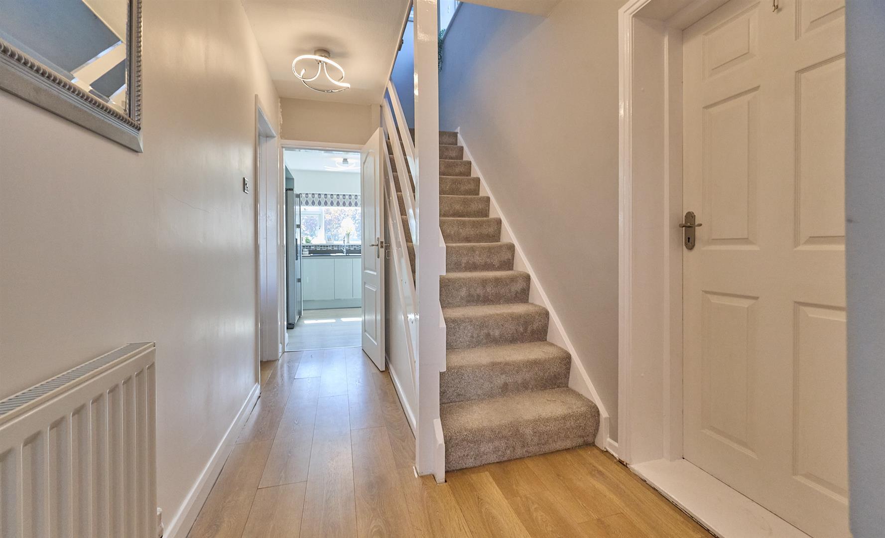 With stairway to the first floor, radiator, smoke alarm, laminate wood strip flooring and door to a storage cupboard housing the fuse box. White panelled interior door to the garage.