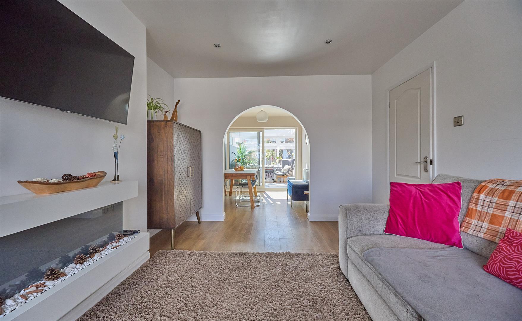 With feature electric fire, laminate wood strip flooring, radiator, inset ceiling spot lights and built in cupboard into the alcoves. Archway to