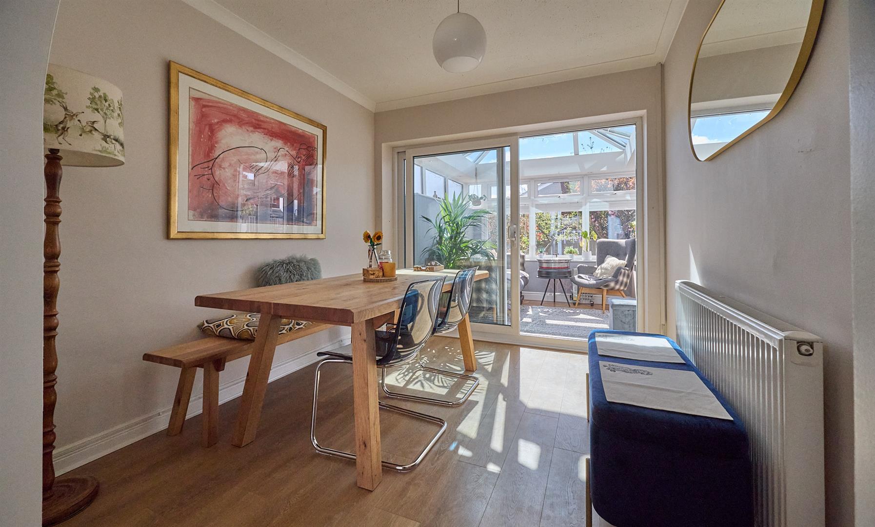 With laminate wood strip flooring, radiator and UPVC SUDG sliding doors to the