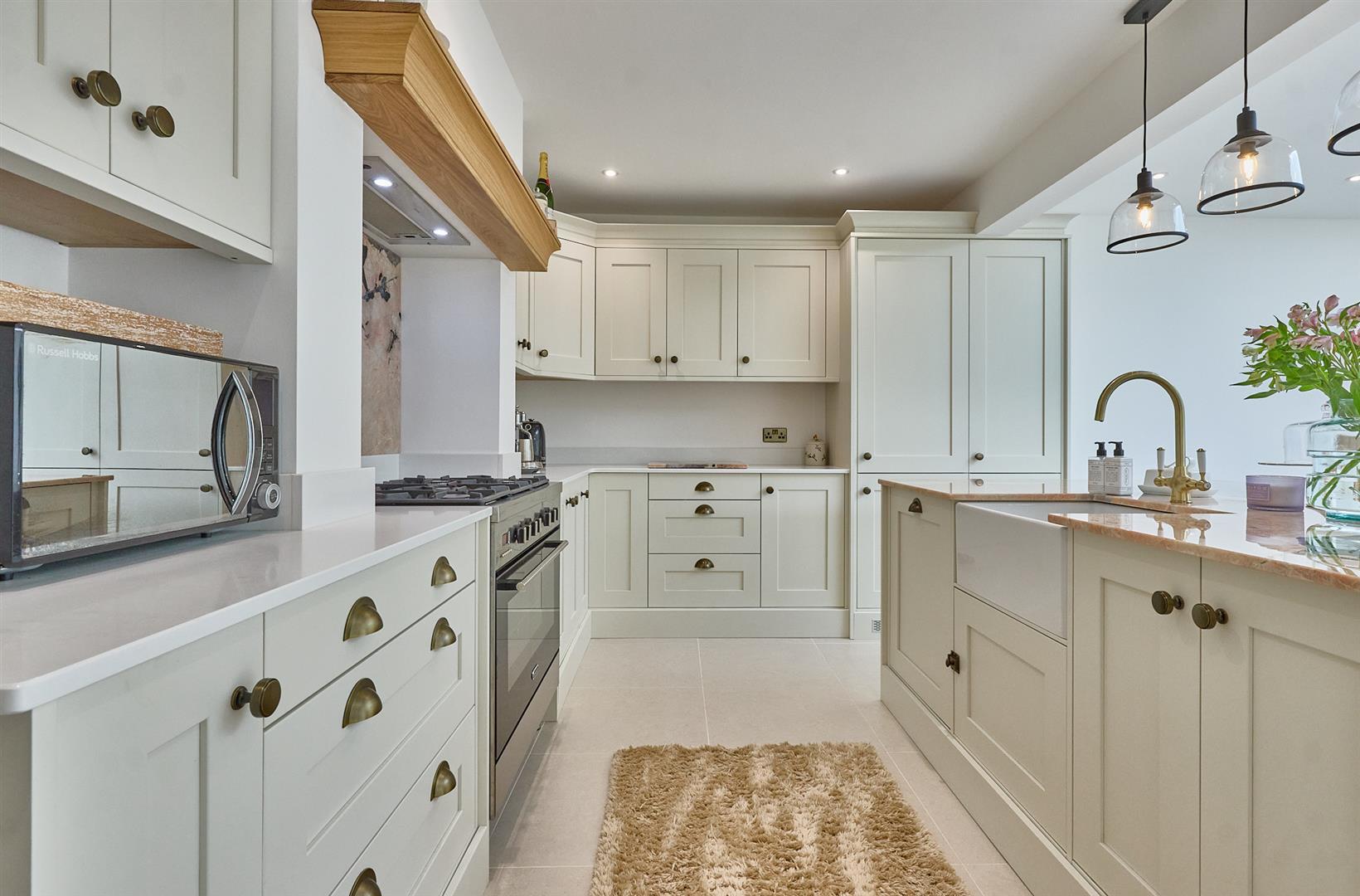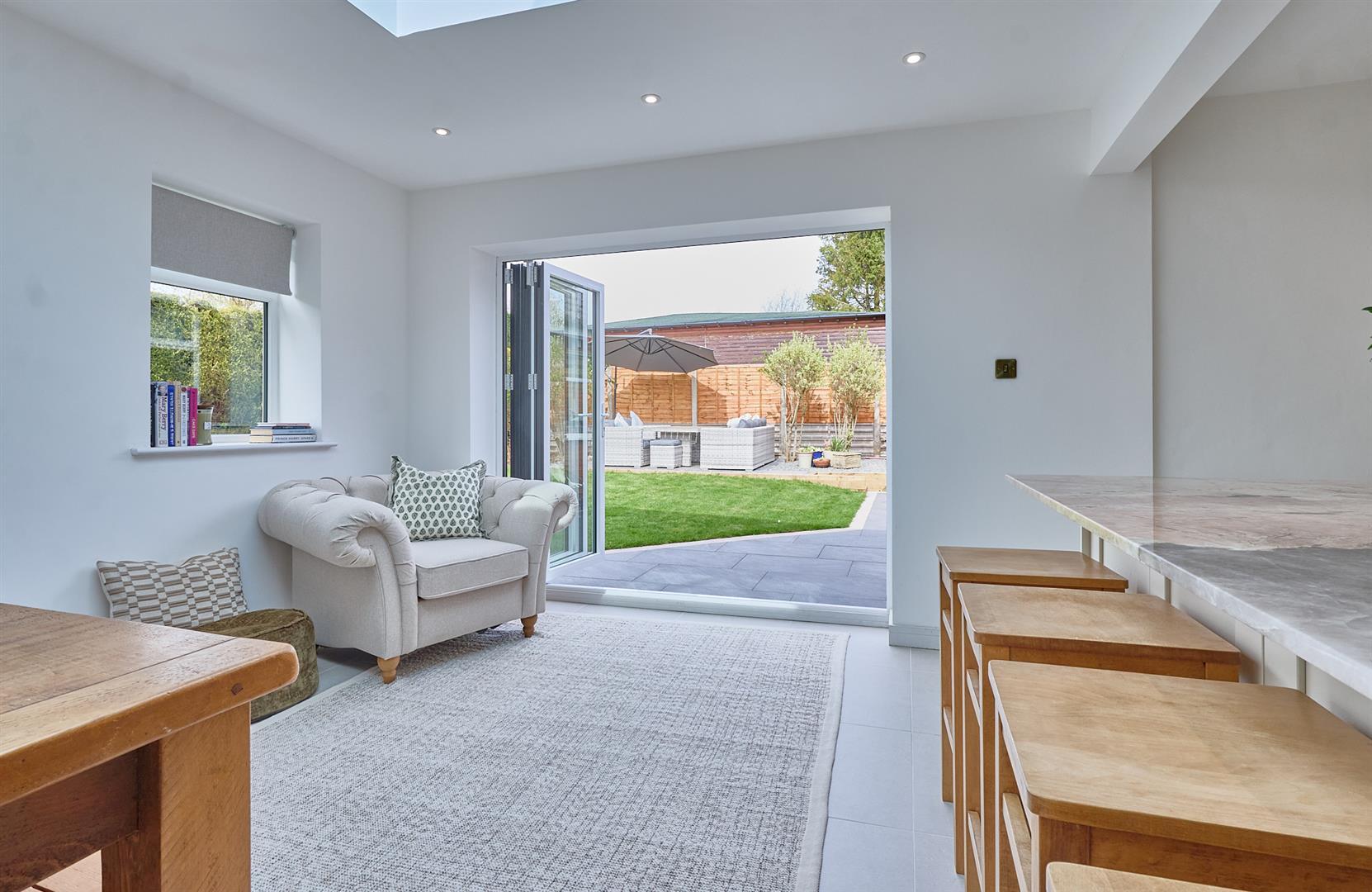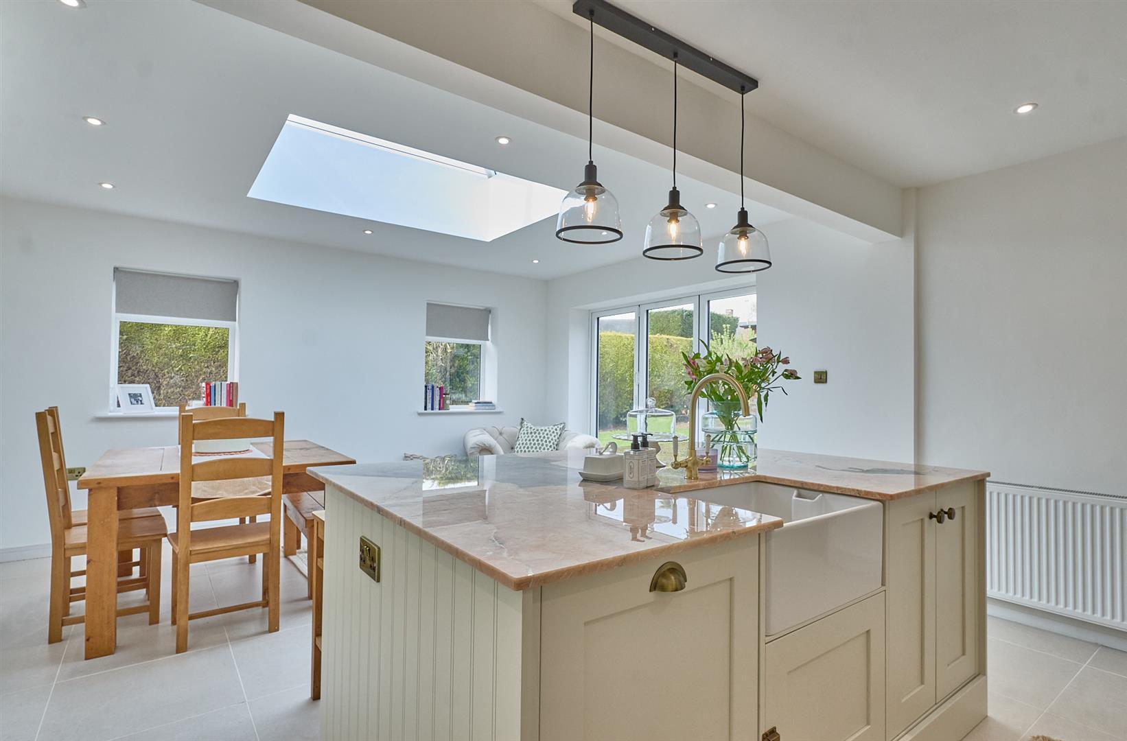 With tiled flooring, inset ceiling spotlights, lantern. Two double panelled radiators, bi-folding doors to the rear garden. A range of cream wood grain kitchen cupboard units which are bespoke and handmade with antique brass handles with quartz working surfaces above, matching upstands. Delonghi Range oven with five ring gas hob unit above, extractor hood. Matching island unit with a contrasting patagonia worktop with antique brass mixer taps, lighting above. Belfast style sink, plumbing for automatic washing machine, built in fridge freezer, dishwasher and matching wall unit. Bespoke oak mantle above the cooker. Door to