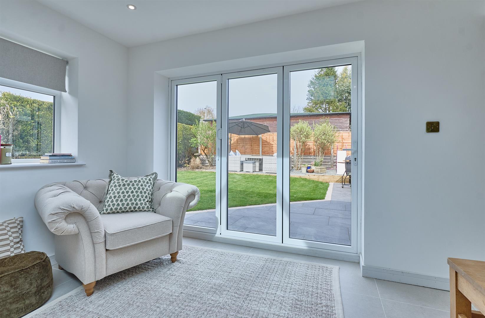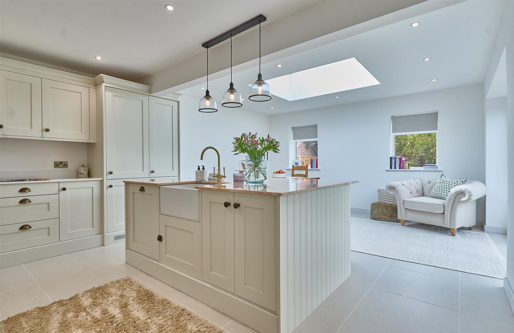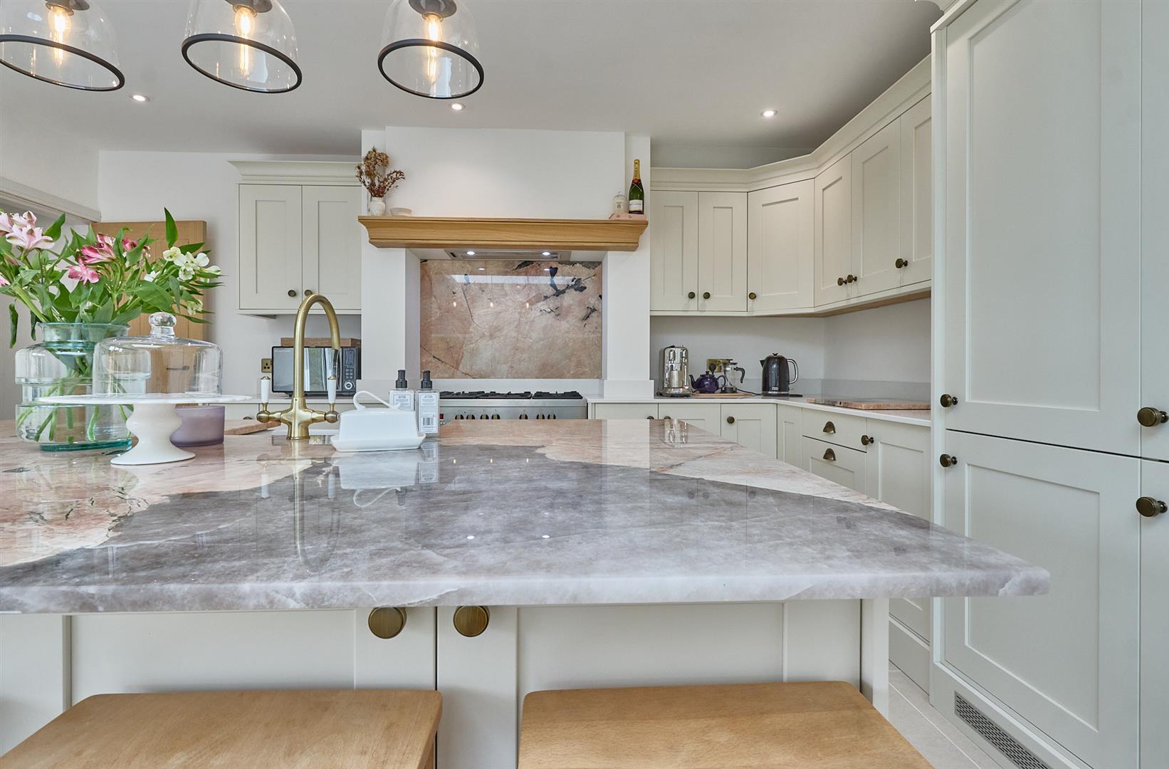 With tiled flooring, inset ceiling spotlights, lantern. Two double panelled radiators, bi-folding doors to the rear garden. A range of cream wood grain kitchen cupboard units which are bespoke and handmade with antique brass handles with quartz working surfaces above, matching upstands. Delonghi Range oven with five ring gas hob unit above, extractor hood. Matching island unit with a contrasting patagonia worktop with antique brass mixer taps, lighting above. Belfast style sink, plumbing for automatic washing machine, built in fridge freezer, dishwasher and matching wall unit. Bespoke oak mantle above the cooker. Door to