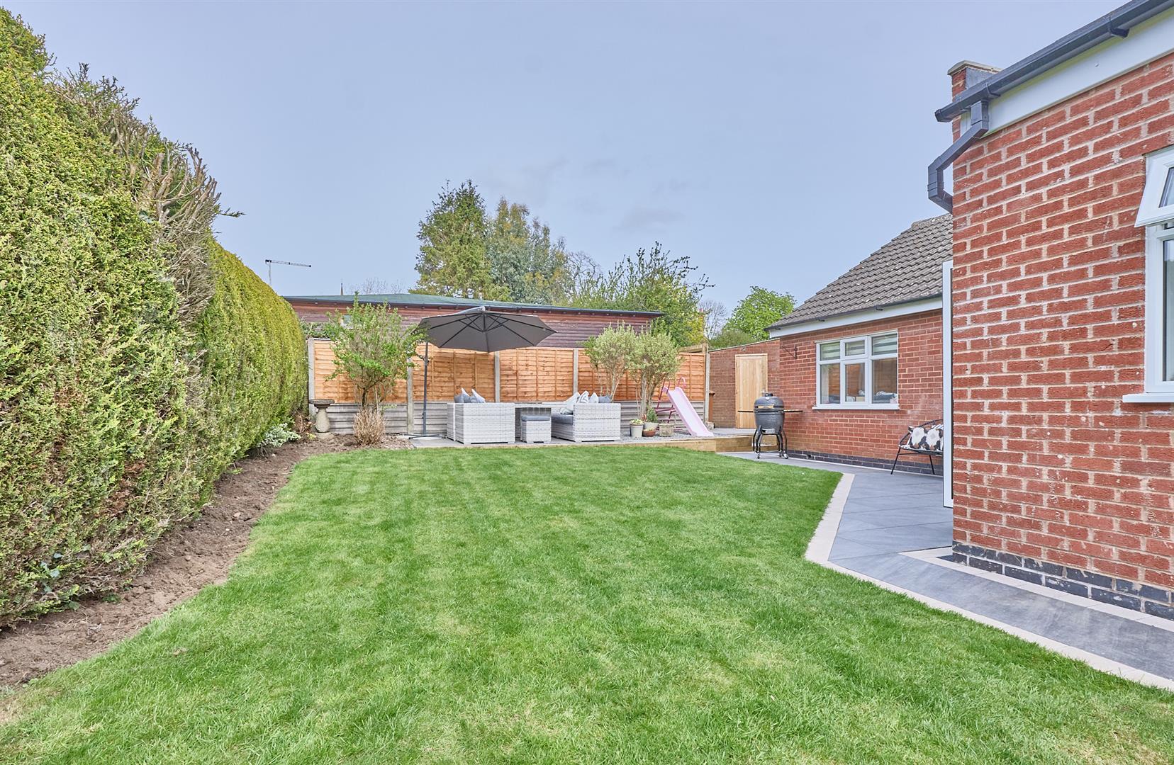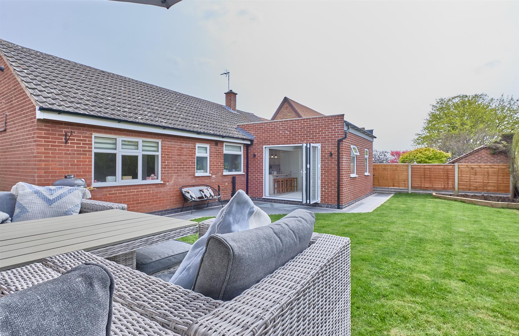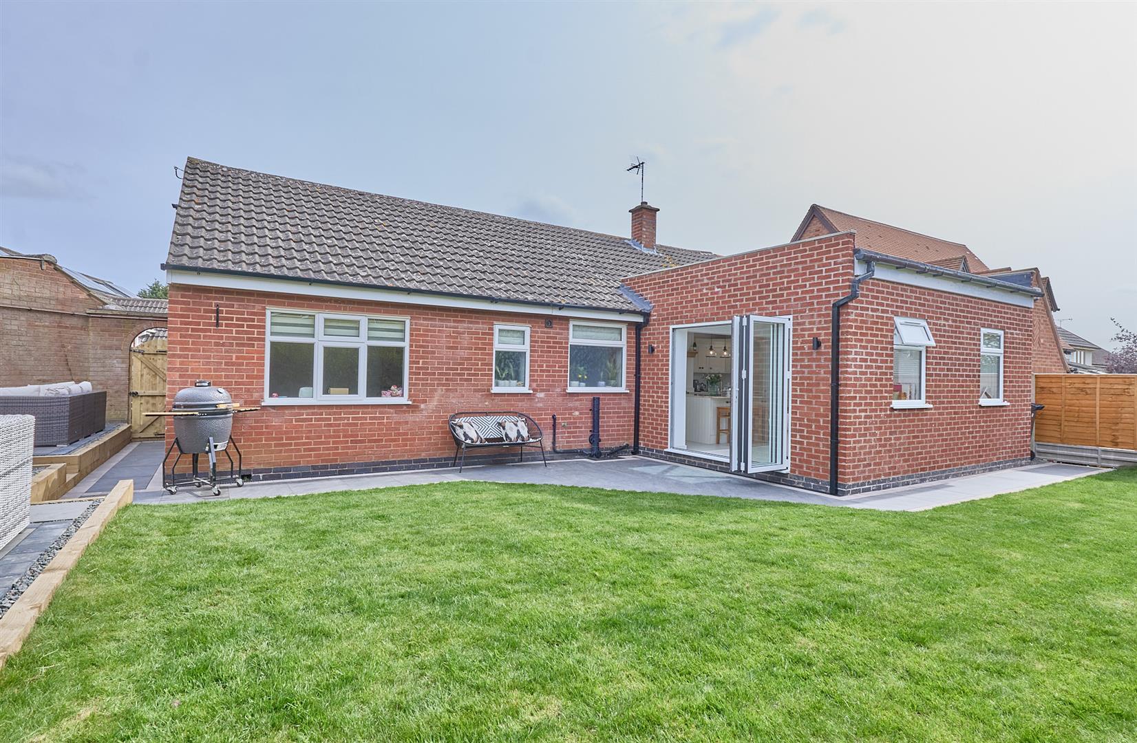 No Chain!! Attractive, extended & refurbished, John Paul & Sons Ltd built detached bungalow on a good sized plot. Sought and convenient cul de sac location within walking distance of the village centre including shops, schools, doctors, dentist, public houses, restaurants and good access to the A5 and M69 motorway. The property benefits from feature fireplace, extended refitted kitchen & bathroom, tiled flooring, fitted wardrobes, gas central heating and UPVC SUDG. Spacious accommodation offers entrance hallway lounge, open plan dining kitchen, two good sized bedrooms and family bathroom with shower. Driveway to single garage. Front and enclosed hard rear garden. Carpets, some of the light fittings, blinds and curtains are included. Viewing highly recommended.