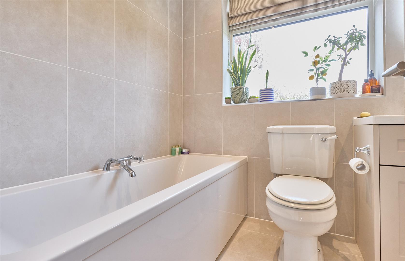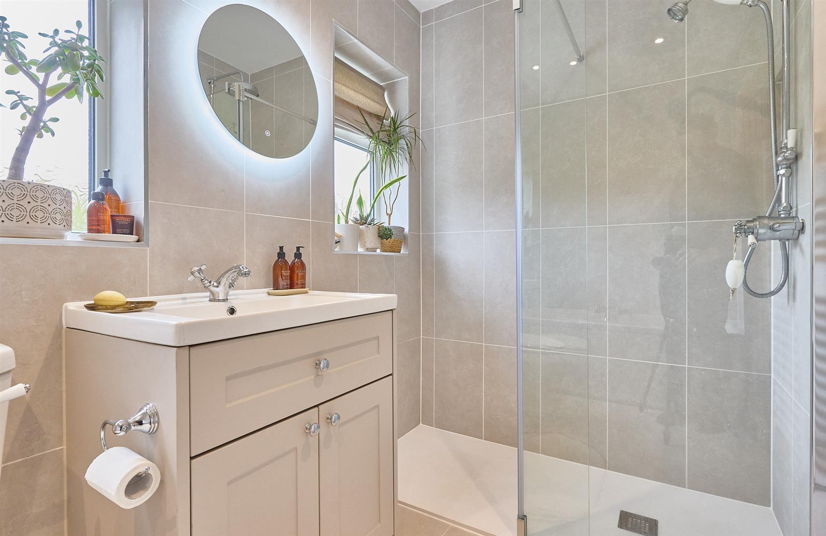 With tiled flooring, four piece suite consisting of a panelled bath with chrome mixer taps above, low level WC, vanity wash hand basin with chrome mixer tap and storage beneath and LED mirror light above, extractor fan. Shower tray with glazed shower screen, bar shower and hand held attachment above, inset ceiling spotlights. White towel heater and tiled surrounds.