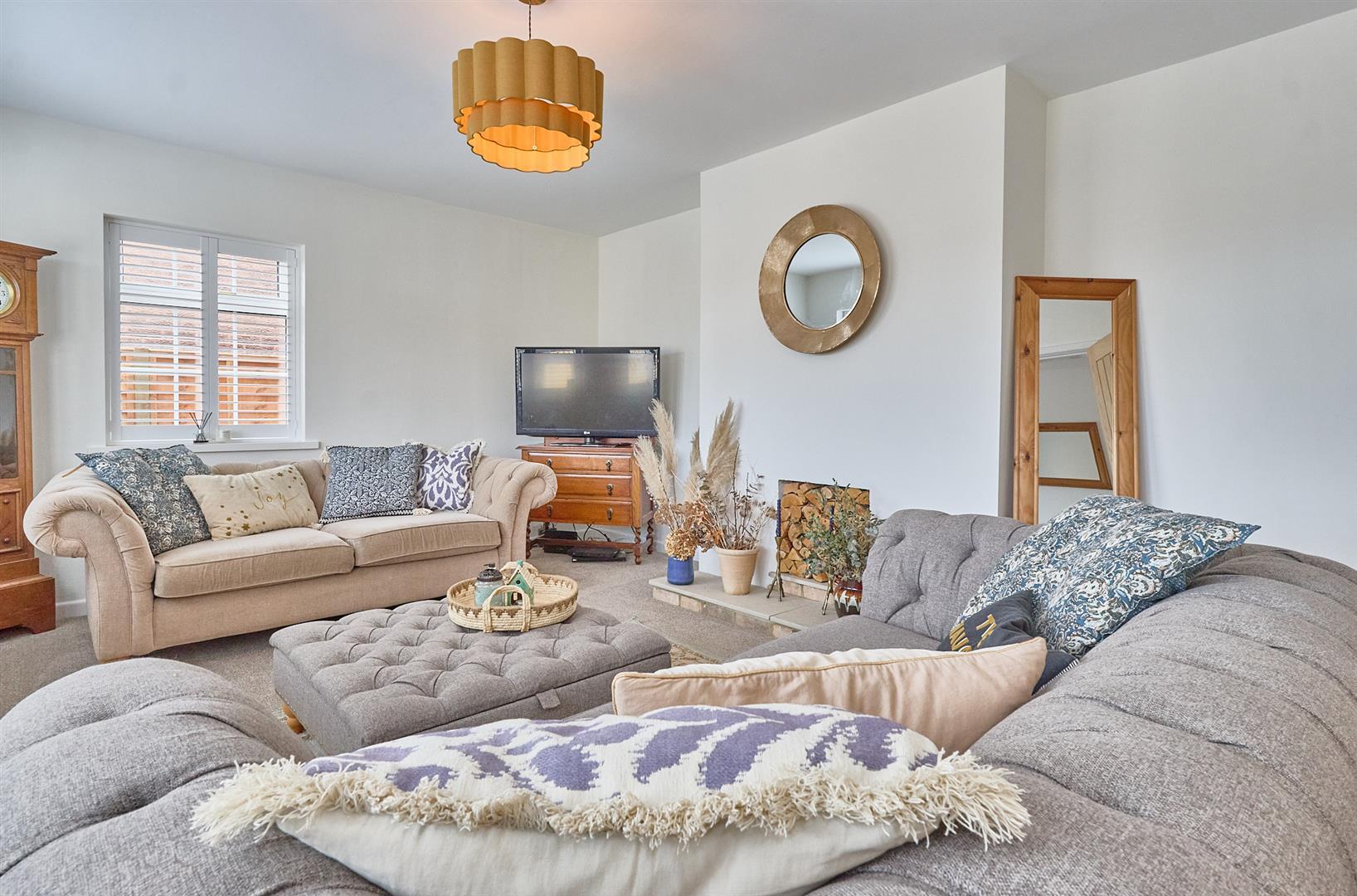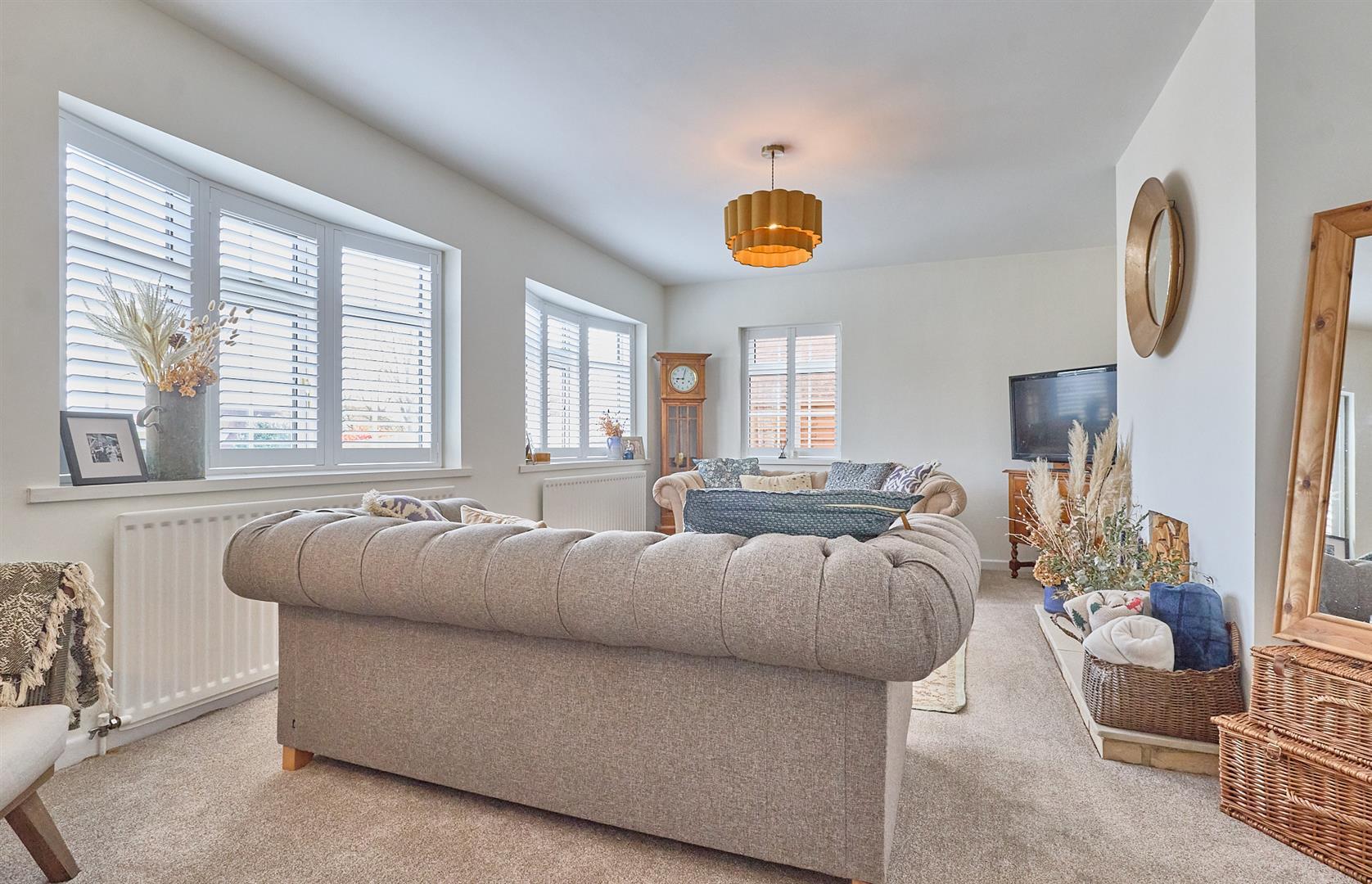 With two single panelled radiator, two bay windows, TV aerial point. Decorative fireplace with stone hearth and bespoke shutter blinds. Door to