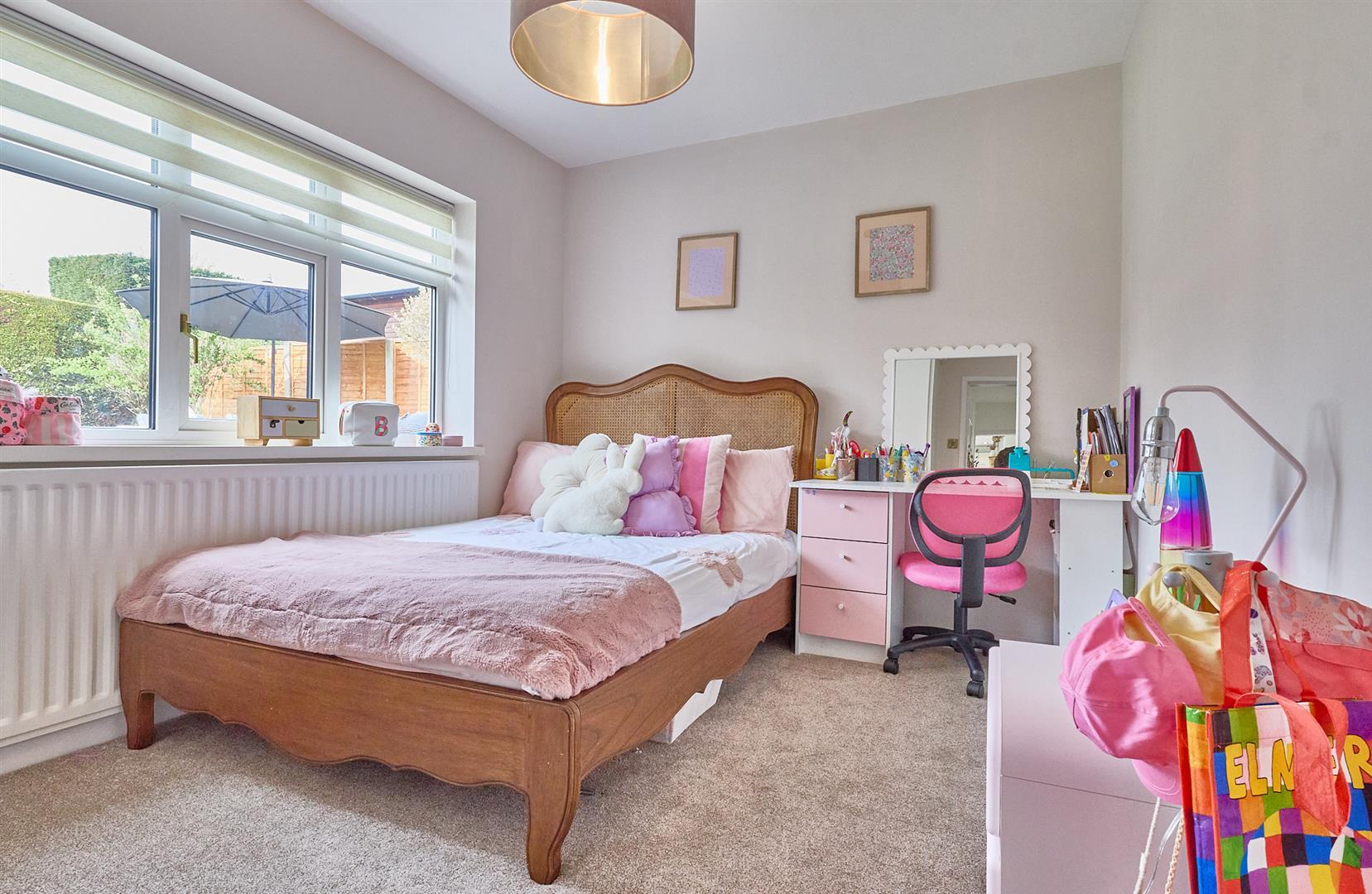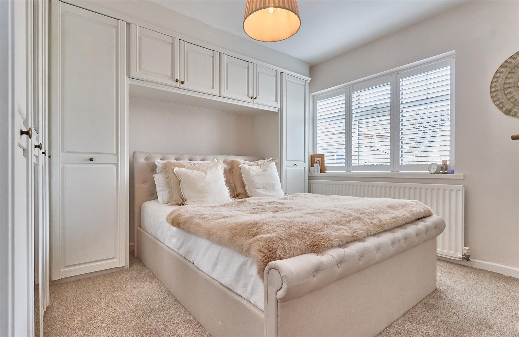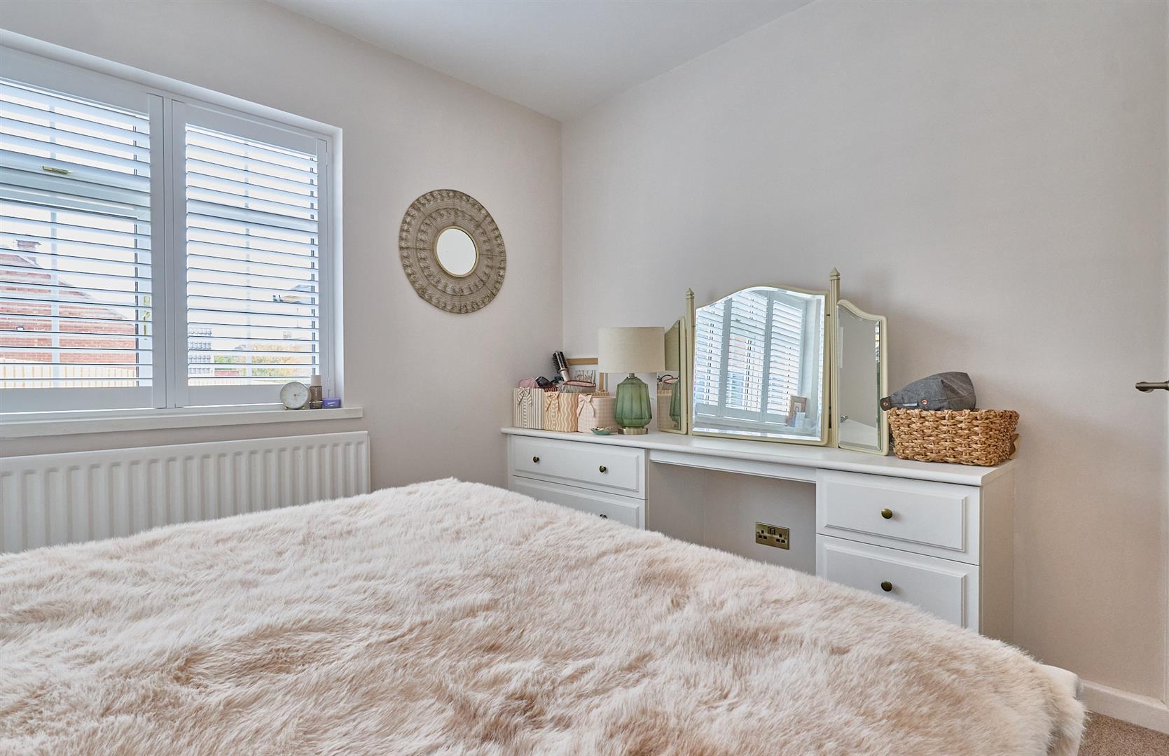 With single panelled radiator, built in wardrobes with shelving and hanging rails, matching dressing table with drawers. Shutters.